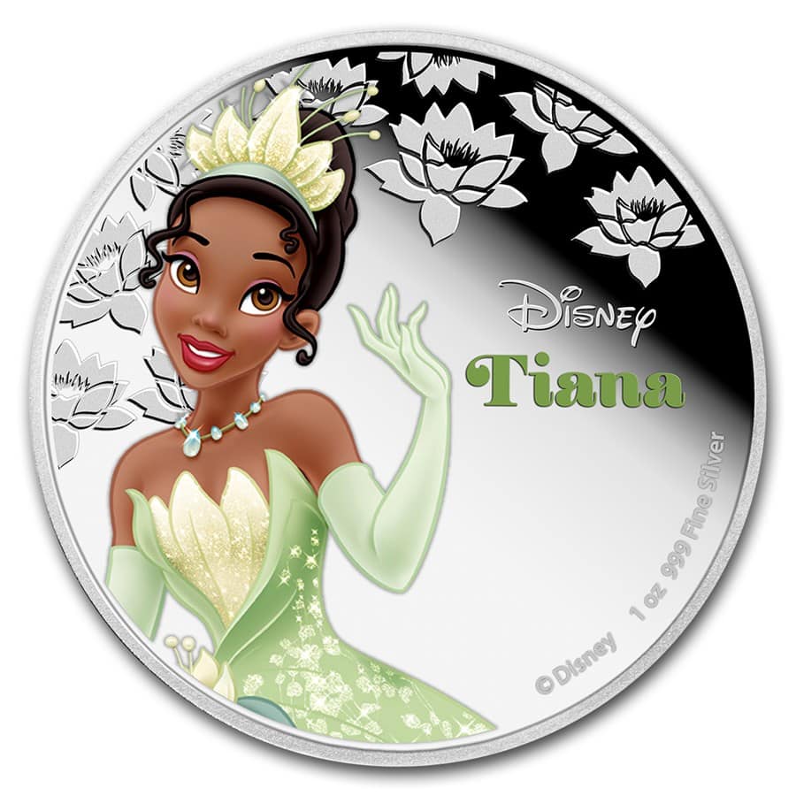 Princess Tiana, from The Princess and the Frog, is the seventh coin from the New Zealand Mint’s Disney Princesses series, which celebrates some of the most memorable Disney characters. Each princess is colorized on high-quality .999 fine Silver.