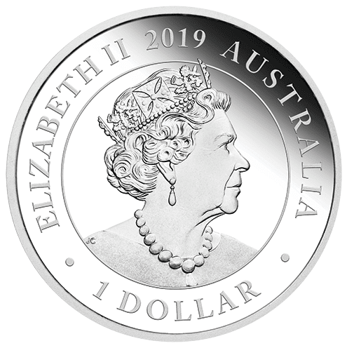 - Obverse: Displays the 6th generation effigy of Queen Elizabeth II to be displayed on Australian coins. The new portrait is based on that designed by Jody Clark of the Royal Mint for 2016. It is distinctively different, however, in that it displays the Queen’s shoulders and full neckline. The band at the rim includes the inscriptions, “ELIZABETH II 2019 AUSTRALIA” at the top, and “1 DOLLAR” at the bottom.
