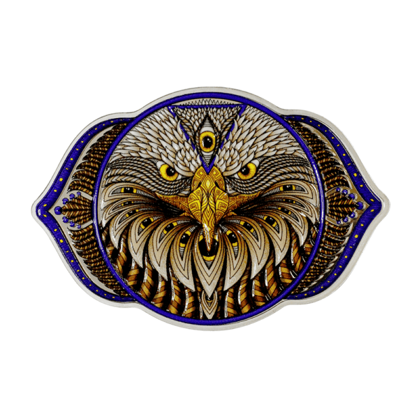 This coin is the fifth in the Seven Chakras series featuring the 6th Chakra also known as the third eye, located in the center of the forehead. It acts as our source of intuition and imagination. When our 3rd eye chakra is open, we are able to see ourselves and the world around us more clearly. With a sharp 3rd eye, we can cut through fabricated illusions. If we shift our perspective beyond the physical plane, we can access deeper truths. Focus like an eagle with this 2oz fine silver legal tender coin engraved and with vibrant color.