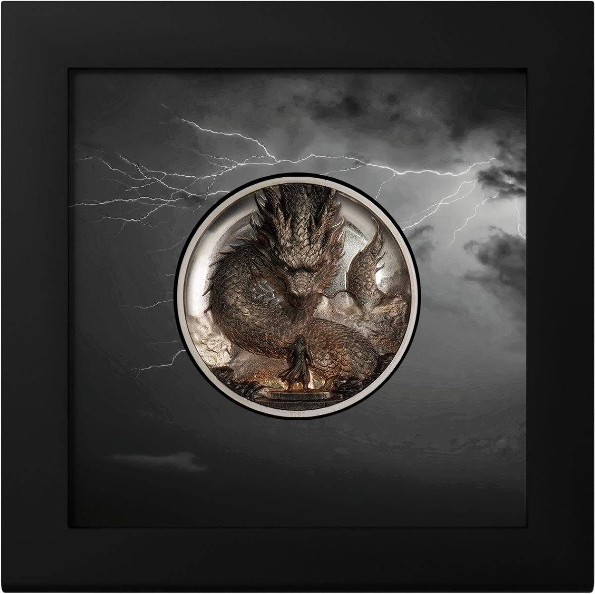 The artwork uses ultra high relief to give both figures a lifelike presence. The concave shape of the coin enhances the effect, making the dragon appear as if it is leaping forward. Additionally, the samurai’s armor and stance are rendered with sharp detail, emphasizing discipline and readiness. The colorization adds another layer of intensity. Fiery tones and electric highlights create an atmosphere filled with thunder, motion, and elemental force. As a result, the entire design feels alive and charged with energy.