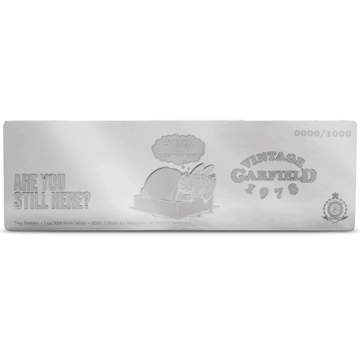 The reverse showcases the full three-panel strip in bold, colorized detail. Every line of Jim Davis’ artwork appears crisp against the polished proof surface. Garfield’s weary expression and his famous punchline remind us why millions love this lasagna-loving cat. On the other side, Garfield smirks in heavy frosting with the thought bubble: “Some call it laziness, I call it deep thought.” This playful addition adds depth to the design and keeps the spirit of the comic alive.