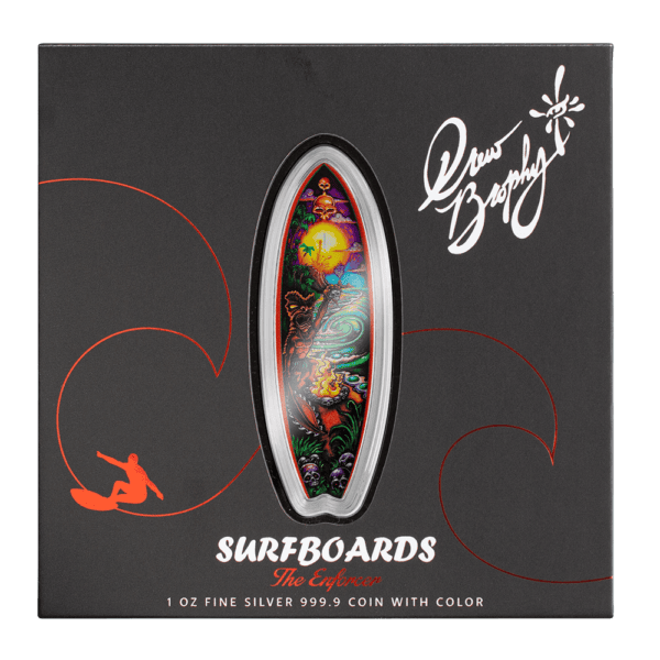 Drew Brophy has been a professional artist for over 30 years. A life-long surfer and traveler, Drew’s career exploded in the late 1990’s when he began painting surfboards using techniques he developed with water based paint pens. His work expanded to include fine art paintings for collectors worldwide. This fan favorite entitled “The Enforcer” is captured in a 1oz pure silver legal tender coin, an original collectible engraved and applied with vibrant color.