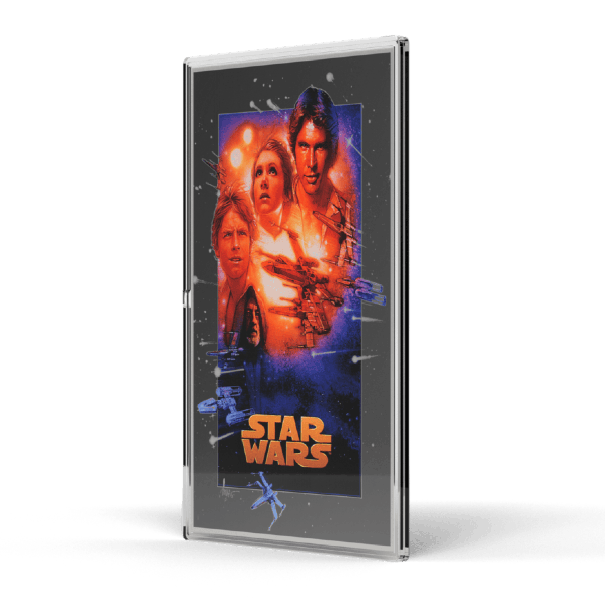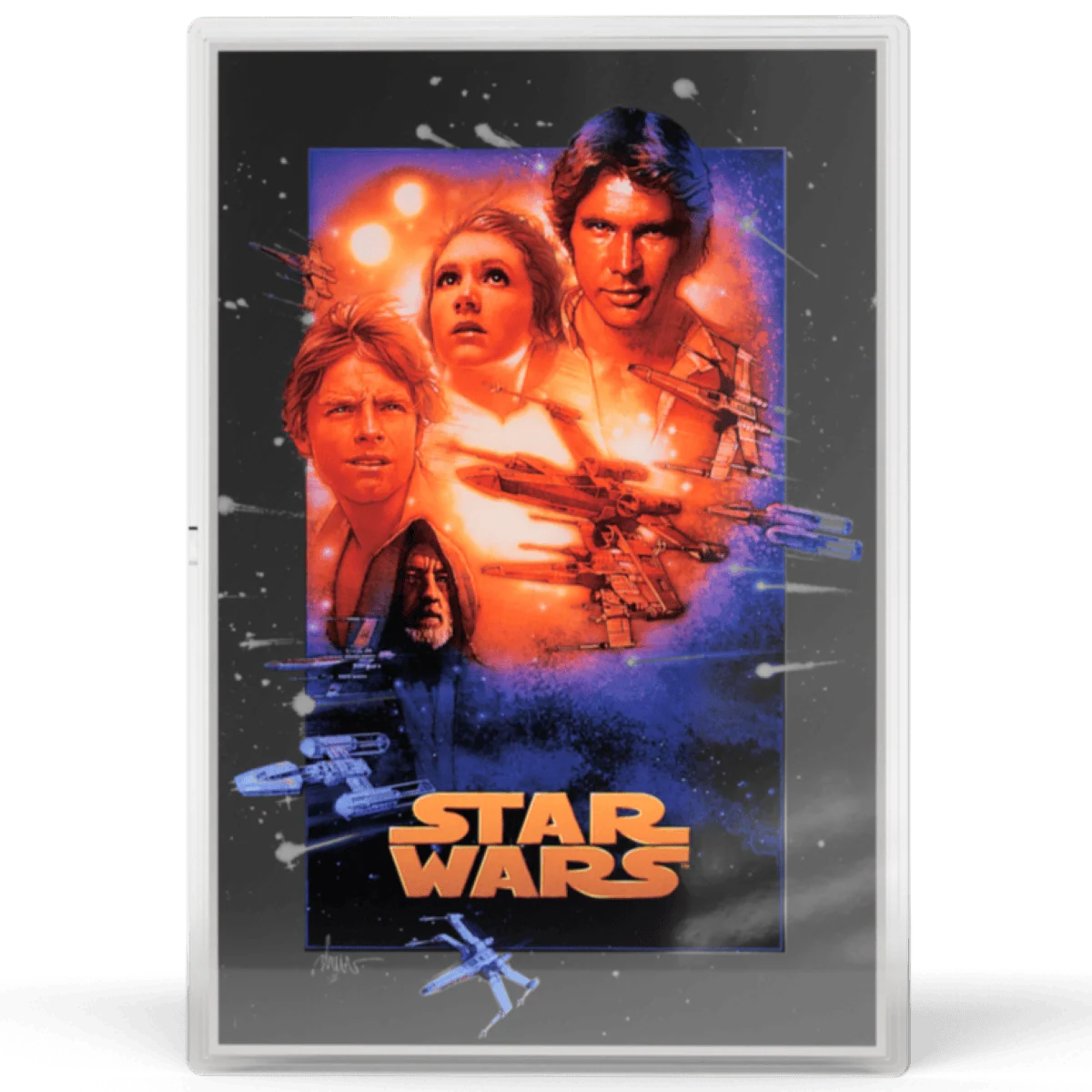Struck in .999 pure silver, this foil carries a $2 denomination and features the Niue Coat of Arms on the reverse. Its large format—175mm x 262mm—offers a bold canvas for full-color artwork from A New Hope. Frosted accents highlight iconic ships, adding depth and contrast to the scene.