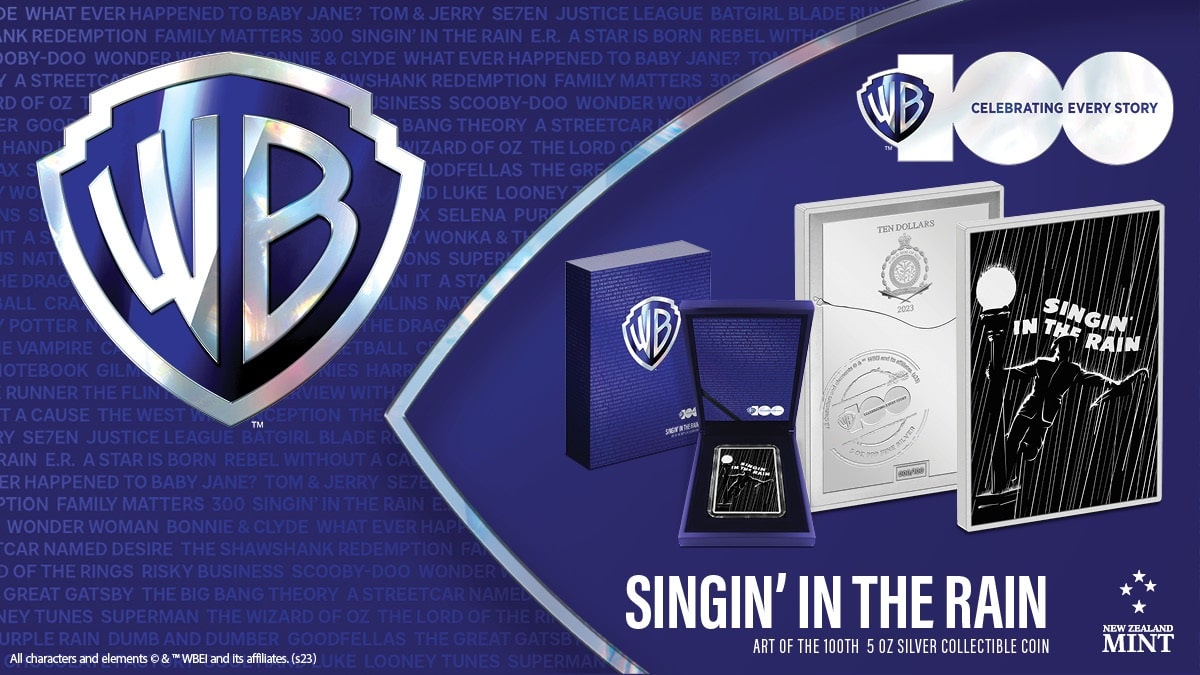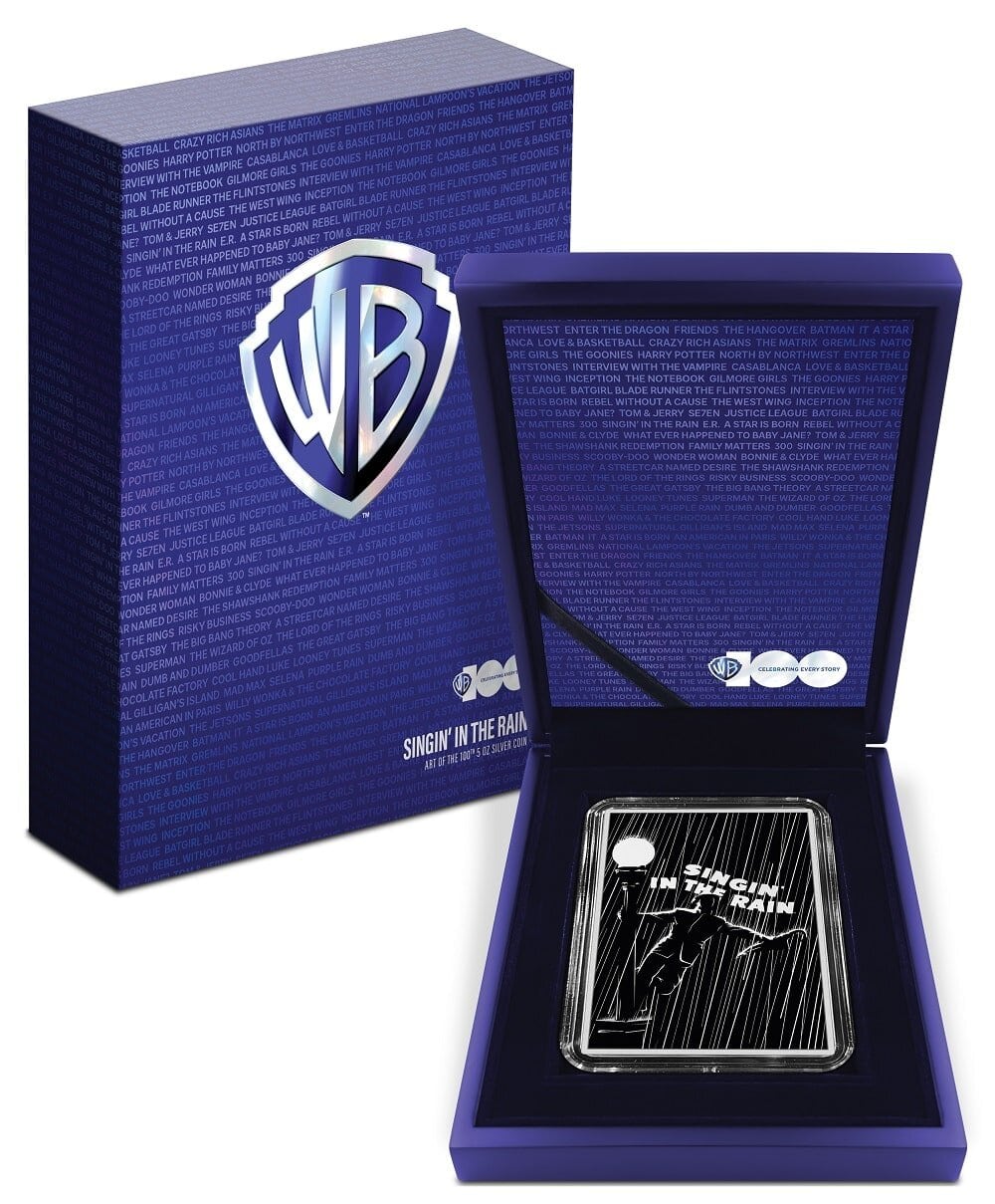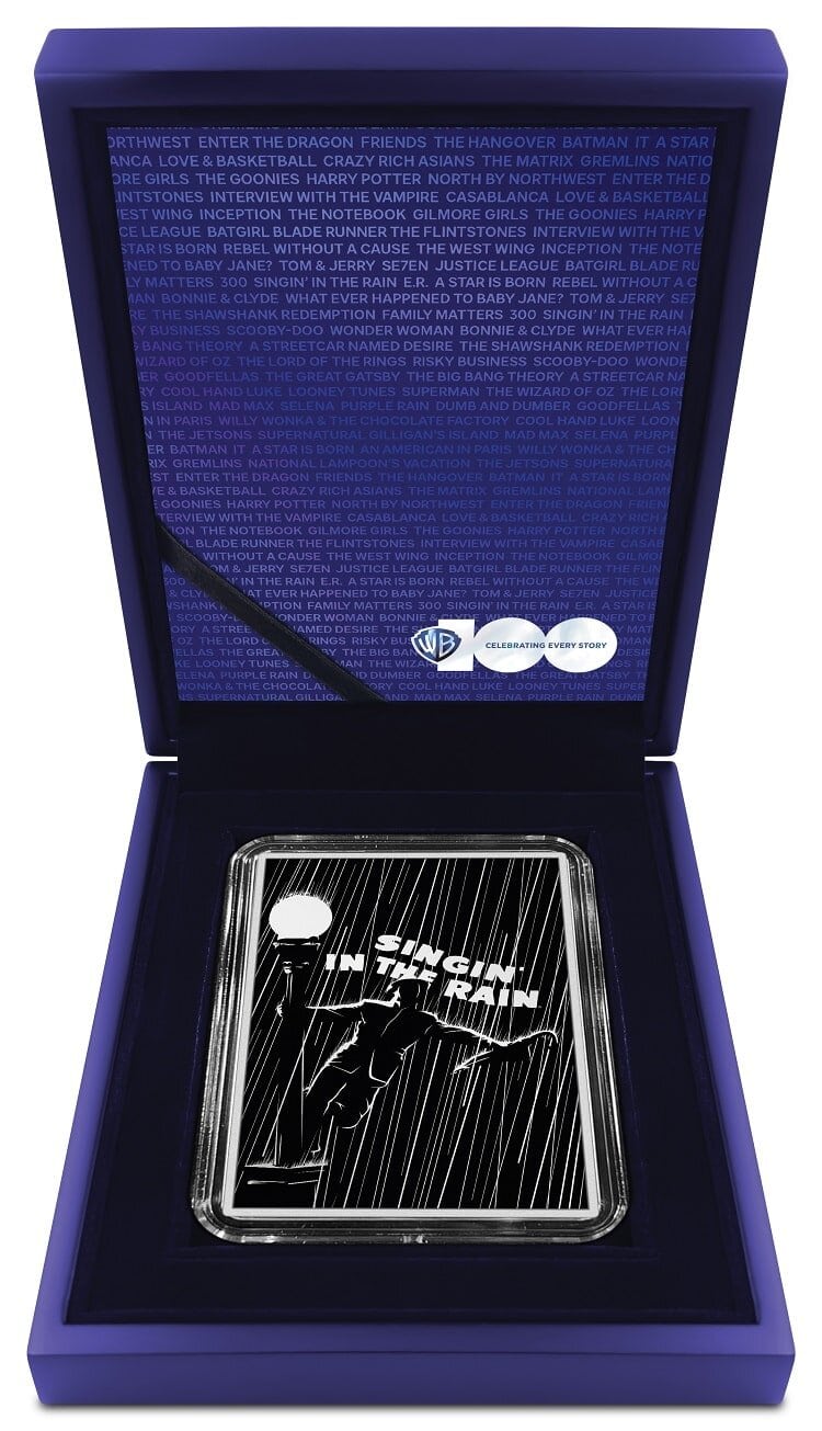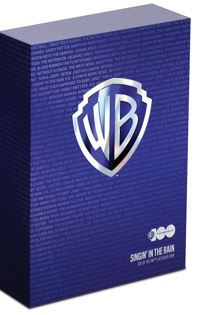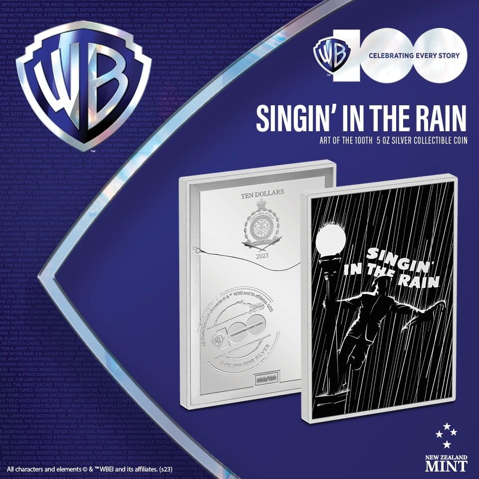 As part of our Warner Brothers 100th-anniversary celebration, we bring you a fantastic new coin series, Art of the 100th! All made from 5oz of pure silver (wow!), each coin shows iconic Warner Brothers films from the ’50s to 90’s. For the first release, we kick off with the iconic movie musical, Singin in the Rain!