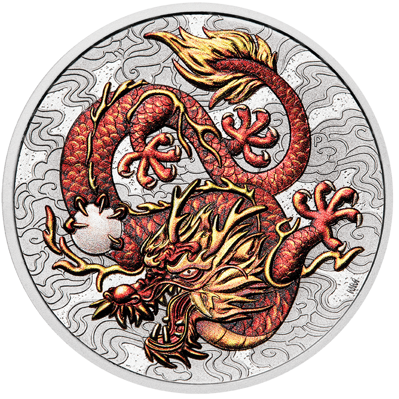 Struck in a full ounce of high pure 99.99% silver, this large coin depicts the Chinese Dragon in all of its mystical supremacy. The intricate image on this legal-tender $1 coin shows the dragon grasping the Pearl of Wisdom as it descends through a bank of unearthly clouds. Plus, the addition of color is just the right element to make the dragon dazzle & burn and burst off the surface of the coin!