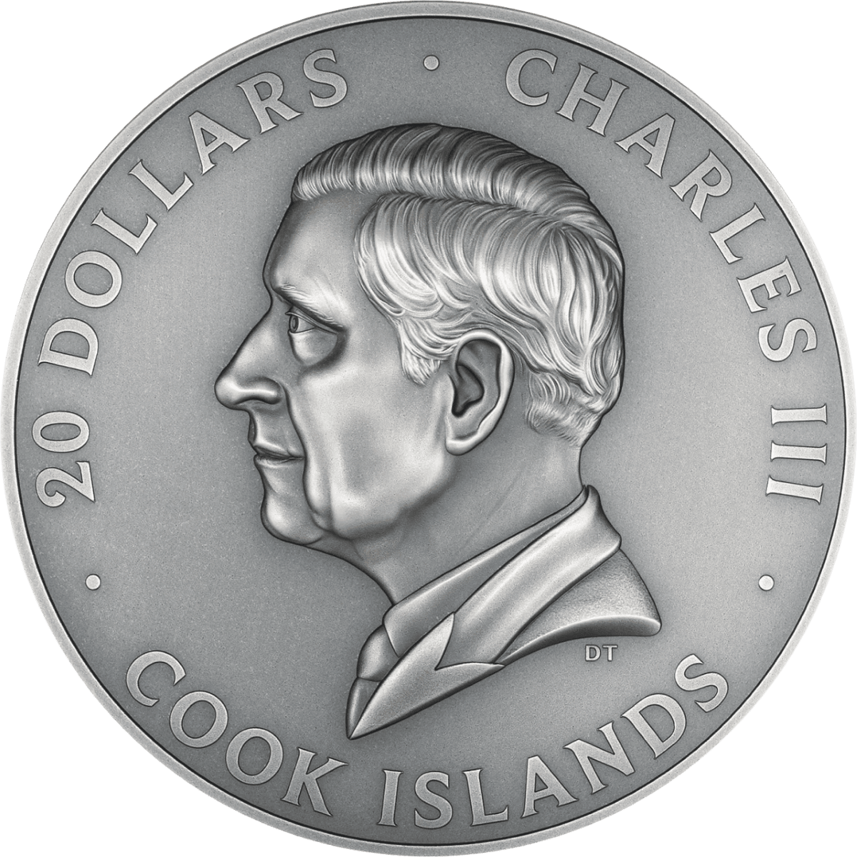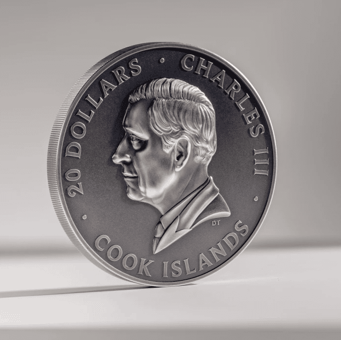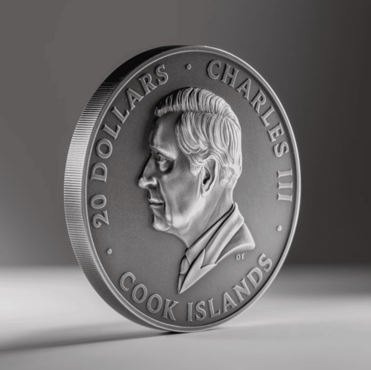 Struck from 3 ounces of .9999 fine silver, the coin features a 50 mm diameter, a rich antique finish, and elegant partial gilding. It carries a face value of $20 and is issued by the Cook Islands. With a limited mintage of only 500 pieces worldwide, it offers true rarity and visual intrigue.