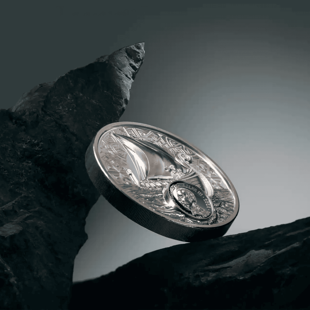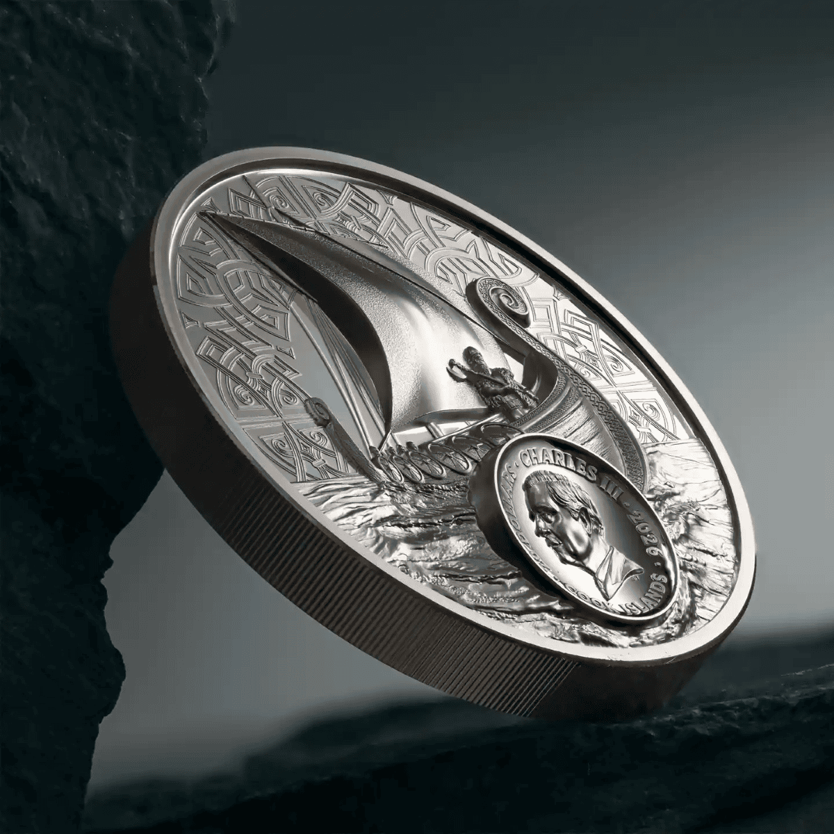 This coin depicts all three figures in ultra-high relief, with fierce expressions and detailed weapons. Their stance boldly declares: “We are ready for anything.” Behind them, the background pattern evokes Valhalla, the sacred hall for fallen warriors in Norse mythology. On the reverse, Ivar sails through rough seas—rendered with stunning realism thanks to smartminting® technology.