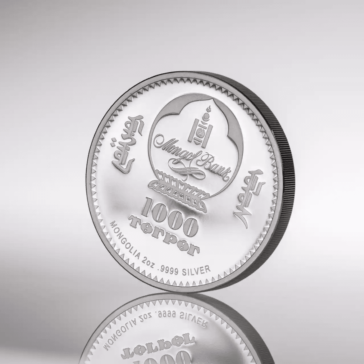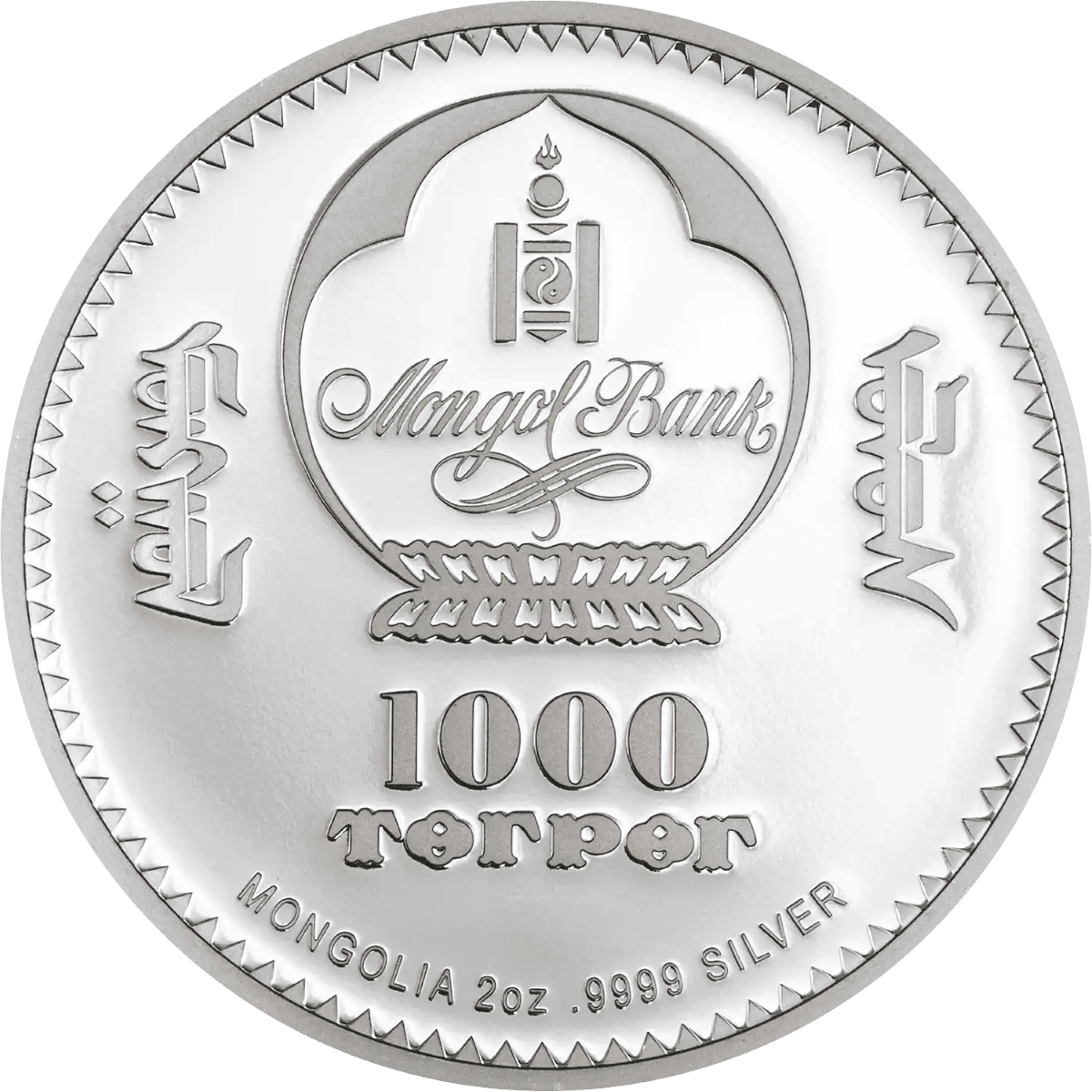 Struck from 2 ounces of .9999 fine silver, the coin features a proof finish, partial gilding, and vivid colorized elements. It measures 38.61 mm in diameter, carries a face value of 1000 Togrog, and is issued by Mongolia. Furthermore, with a limited mintage of just 888 pieces worldwide, it offers true rarity and prestige.