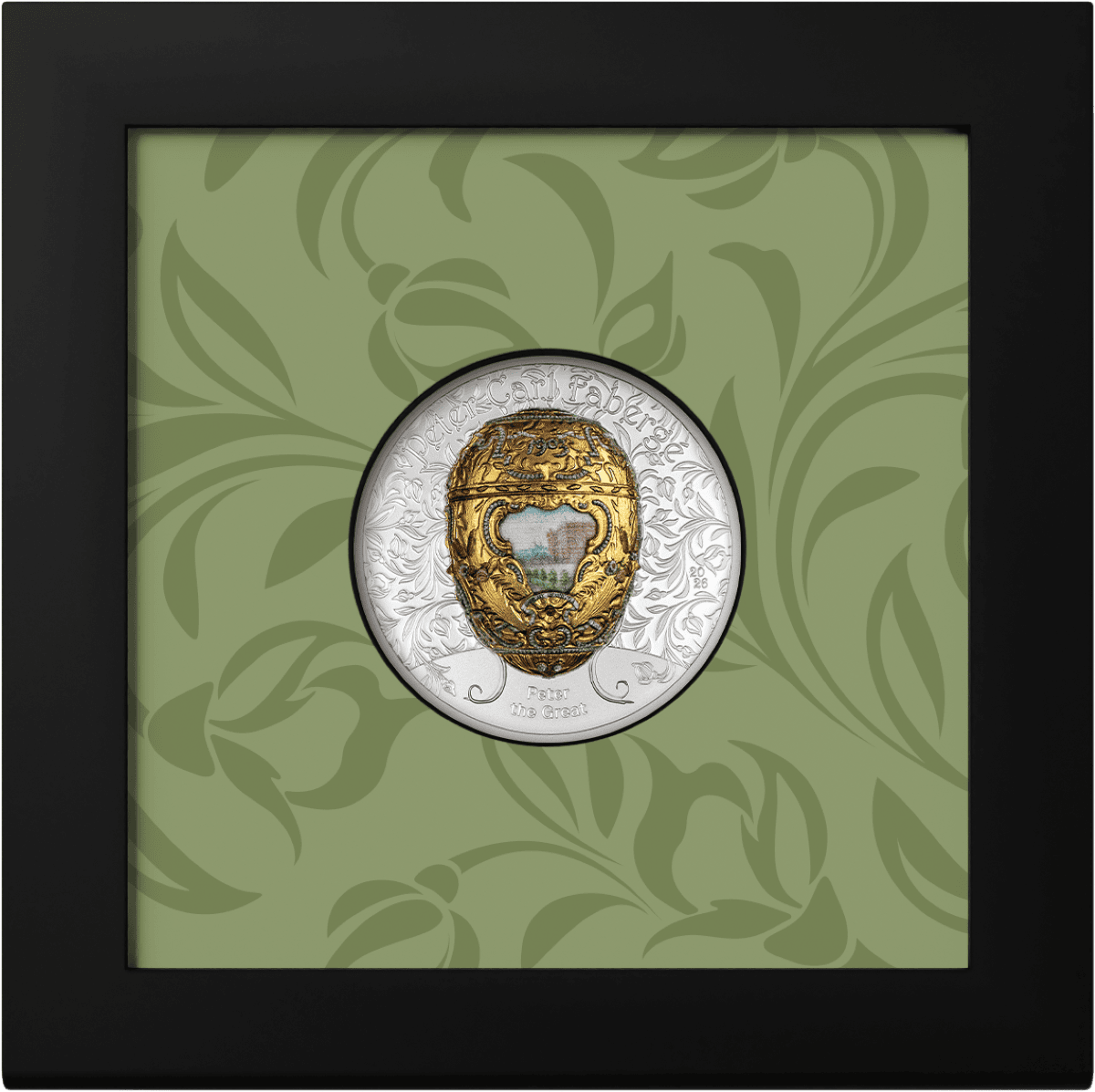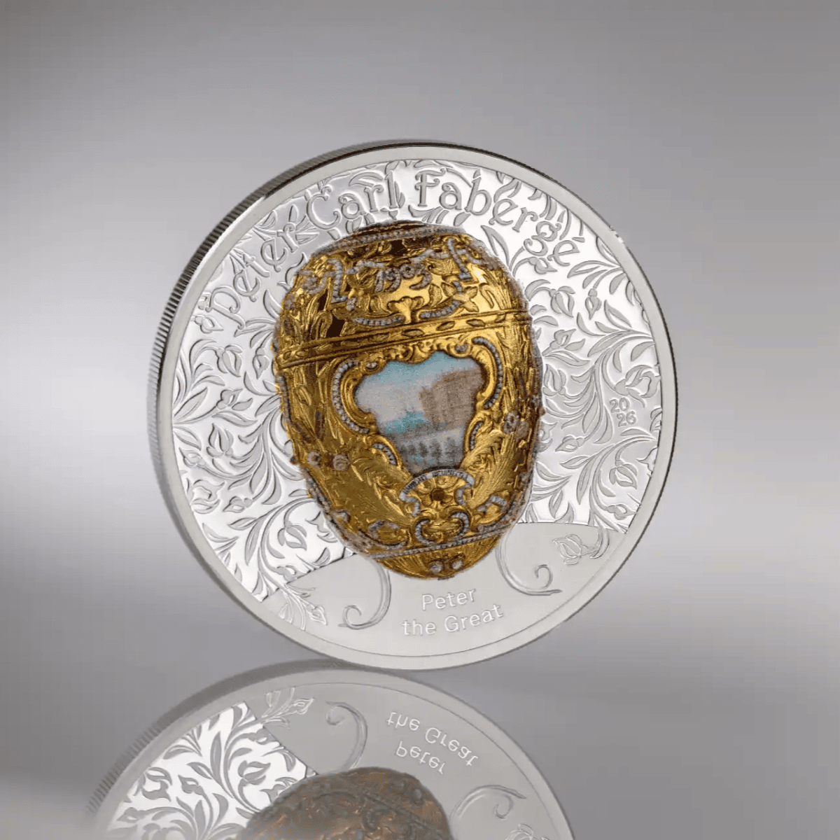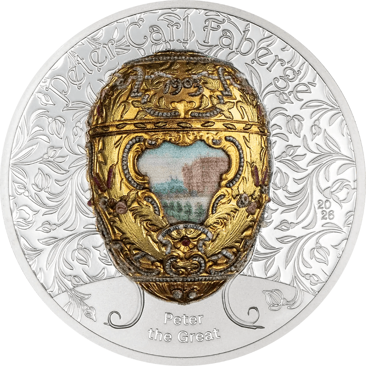 Inside the egg, a finely detailed image of the Winter Palace reinforces its historical link to Peter the Great. Meanwhile, the gleaming inscription “Peter the Great” adds depth and distinction. A reeded edge completes the coin’s sophisticated profile.