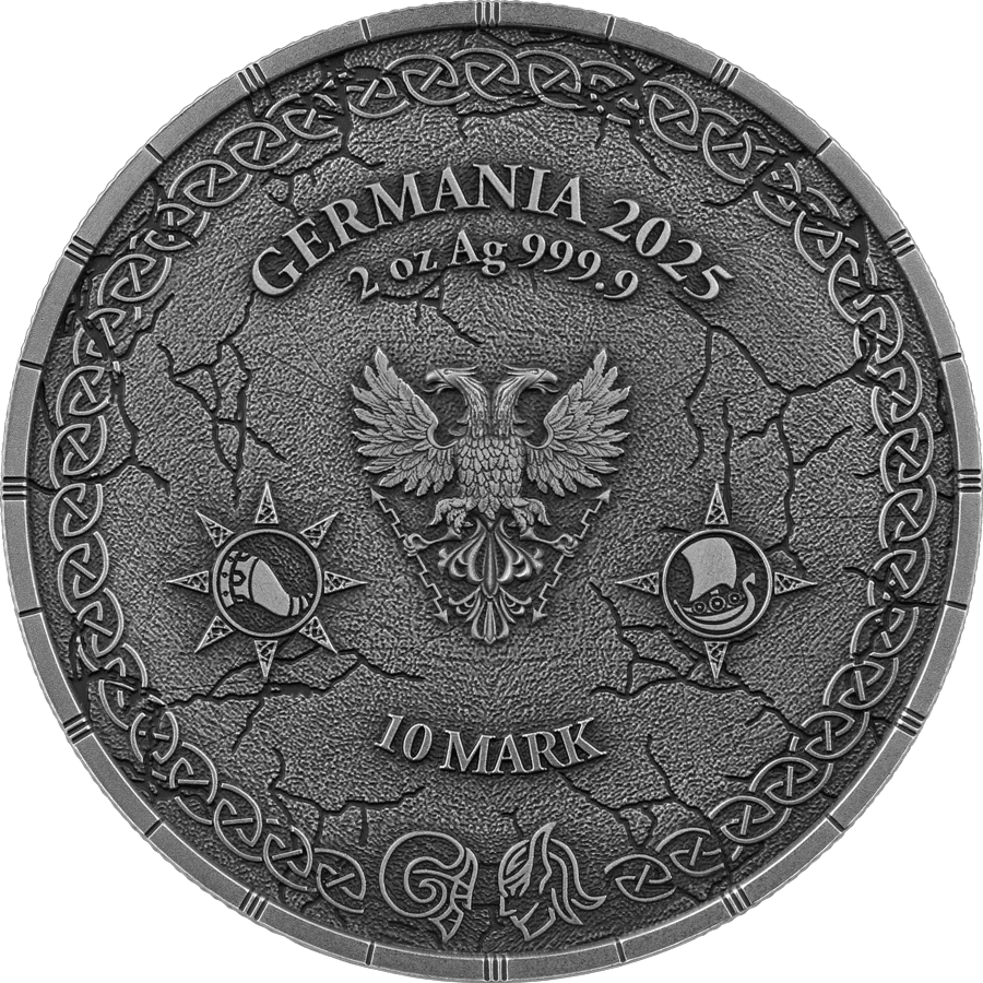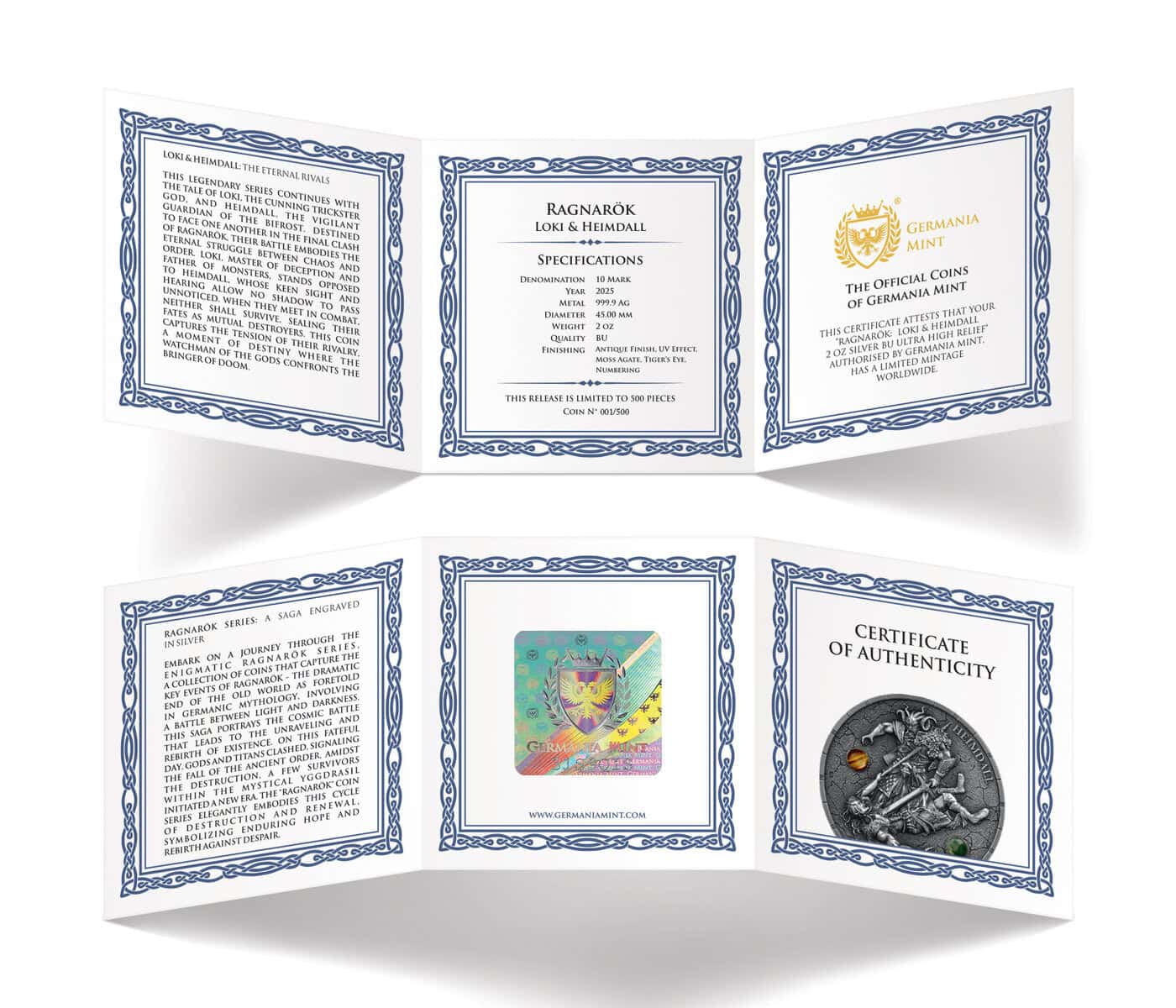 The reverse continues the theme of destiny and ruin. It features Loki’s ship and Heimdall’s horn, resting upon a fractured Earth. Above them, the double-headed eagle, emblem of Germania Mint, spreads its wings—representing endurance through transformation. The combination of antique texture and raised relief adds remarkable depth and realism.