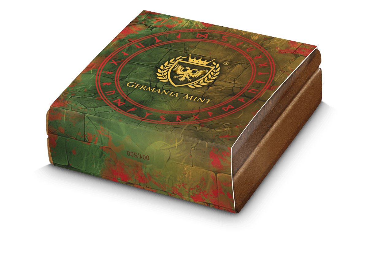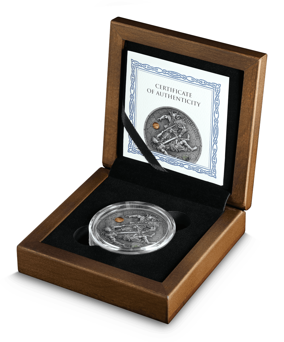 Because of its antique finish, ultra-high relief, and UV-activated details, this coin stands as one of the most dramatic issues in the Ragnarök Series.