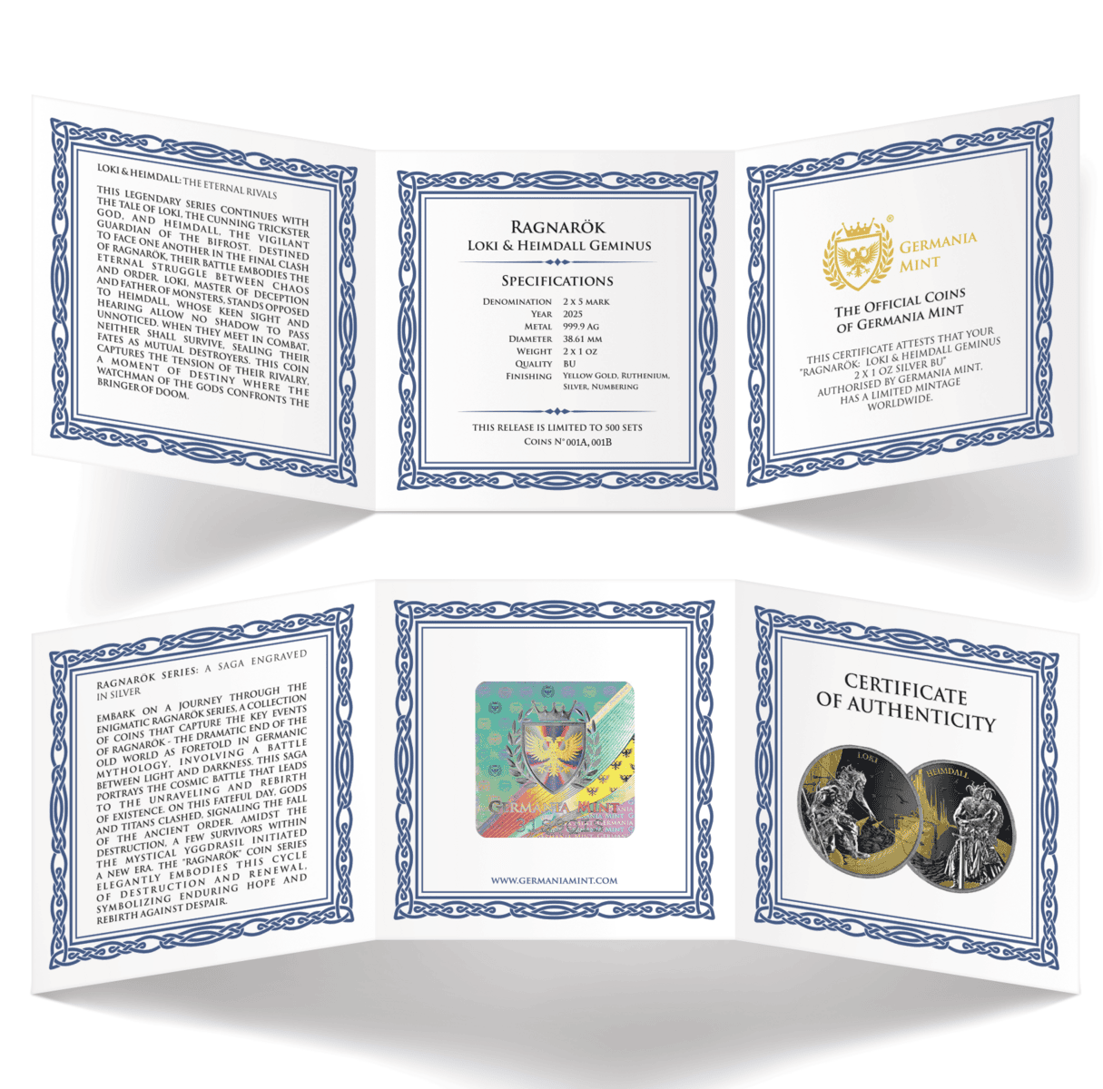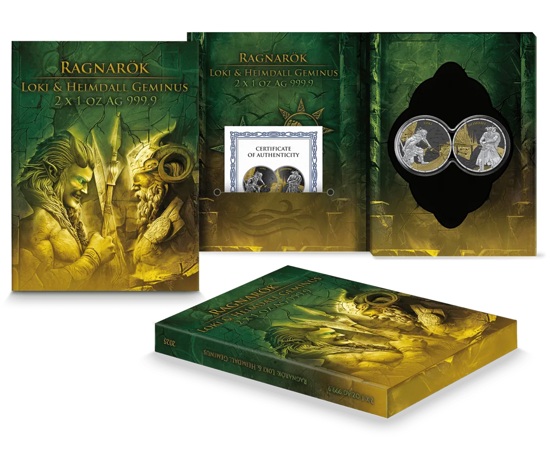 The Ragnarök: Loki & Heimdall Geminus Set stands as one of Germania Mint’s most ambitious projects. It unites storytelling, fine metalwork, and collector innovation into one offering. Whether you collect Norse mythology, rare mint issues, or unique dual-coin formats, this set delivers both artistic and investment appeal.