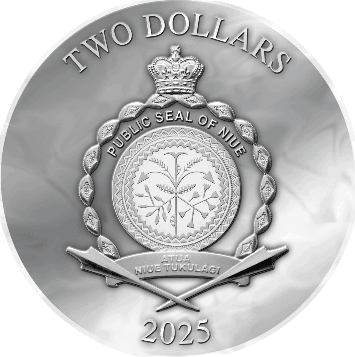 Meanwhile, the obverse features the Public Seal of Niue, including a crown, crossed traditional weapons, and the national motto “ATUA NIUE TUKULAGI.” The inscriptions “TWO DOLLARS” and “2025” confirm its legal tender status and year of issue. Consequently, the polished background enhances the seal’s intricate detail and sovereign elegance.