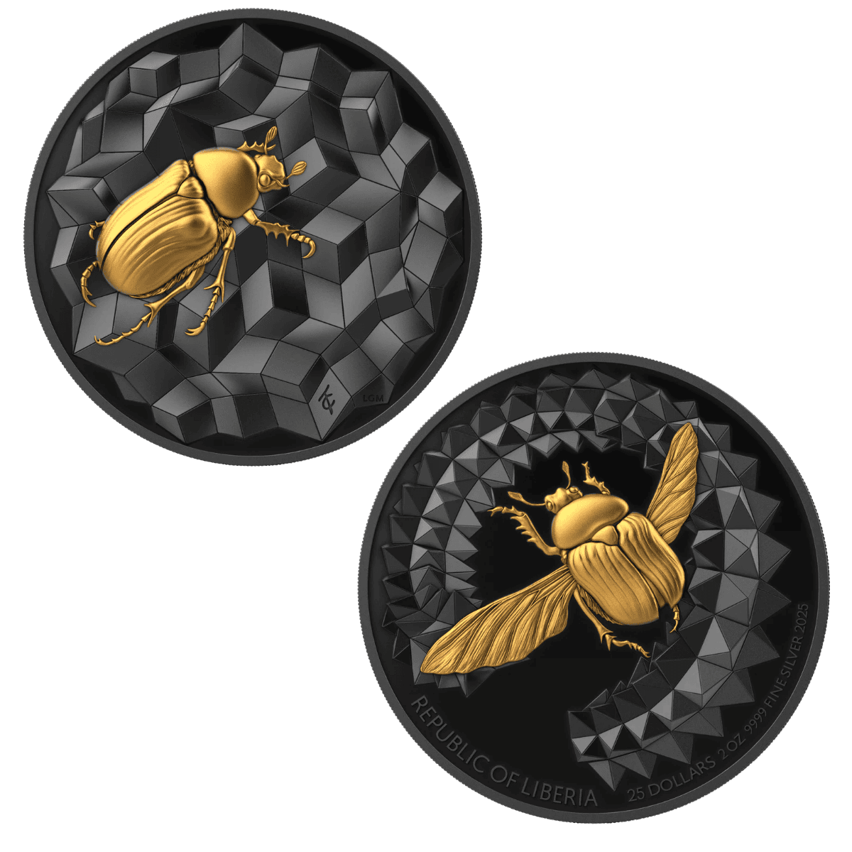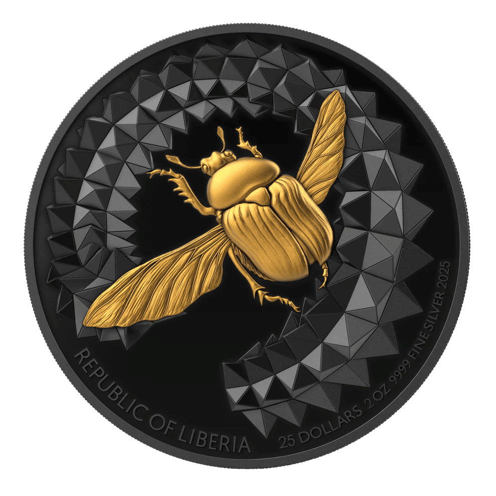 The Éntoma 2025 Scarabeo 2 oz .9999 Silver Ultra High Relief “Dark” Gold-Plated Proof Coin delivers dramatic contrast, powerful symbolism, and exceptional scarcity. Struck for Liberia by Le Grand Mint, this remarkable release expands the acclaimed Èntoma series with a bold visual presence. Moreover, its layered ruthenium and gold-plated finish creates a striking dark proof effect that sets it apart from traditional silver issues.