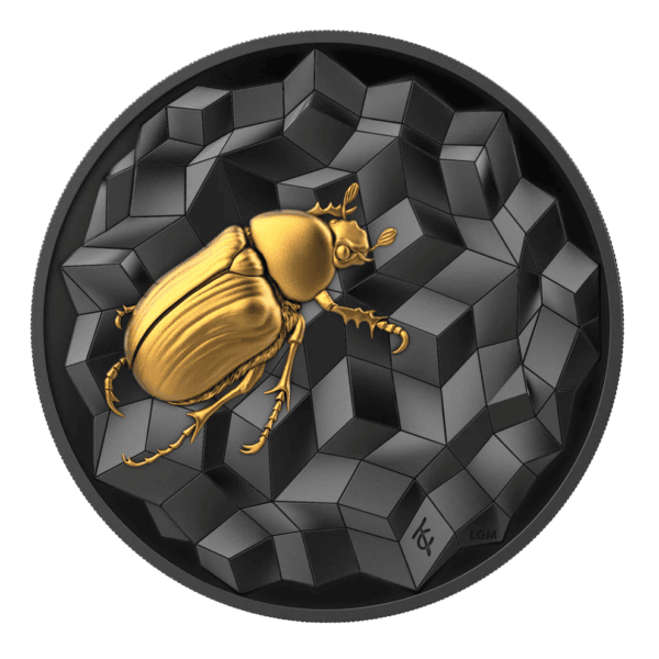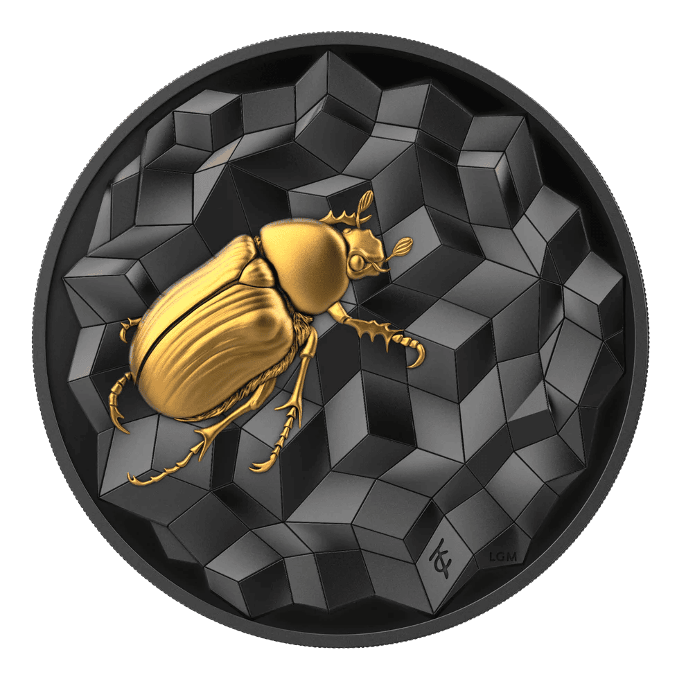 Crafted from 2 troy ounces (62.2 grams) of .9999 fine silver and measuring 38.6 mm in diameter, this coin combines substantial weight with advanced minting precision. The ultra high relief strike gives the scarab impressive depth and texture. As a result, the design rises sharply from the surface, delivering strong dimensional impact.