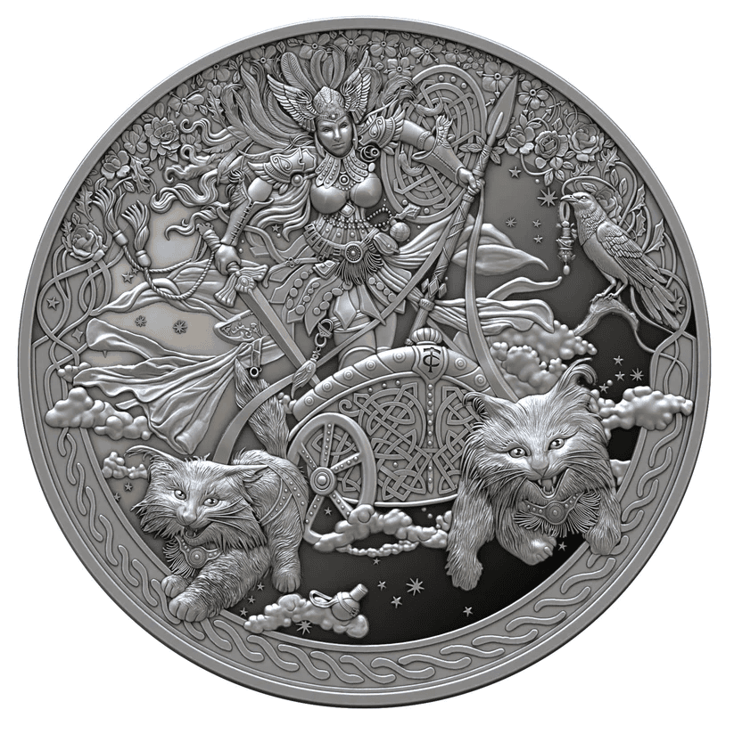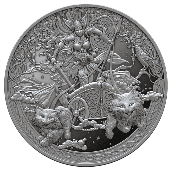 The coin is designed by the renowned artist Carmen Testa. Freya is shown wearing her feathered cloak, which allows her to fly across worlds. Her chariot, drawn by magical cats, highlights her heroic and commanding presence. The Ultra High Relief Proof finish adds depth and realism, ensuring every detail is vivid and lifelike.