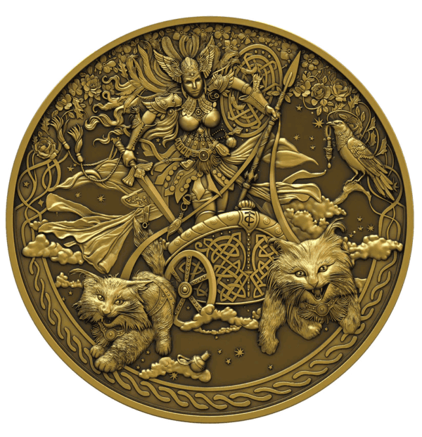 Designed by renowned artist Carmen Testa, the coin shows Freya in her iconic feathered cloak, which allows her to fly across realms. Additionally, she rides a chariot drawn by cats, highlighting her strength and magical nature. The Ultra High Relief Antique Gold finish enhances every detail, creating a vivid, lifelike appearance. As a result, the coin becomes not only a collectible but also a true work of art.