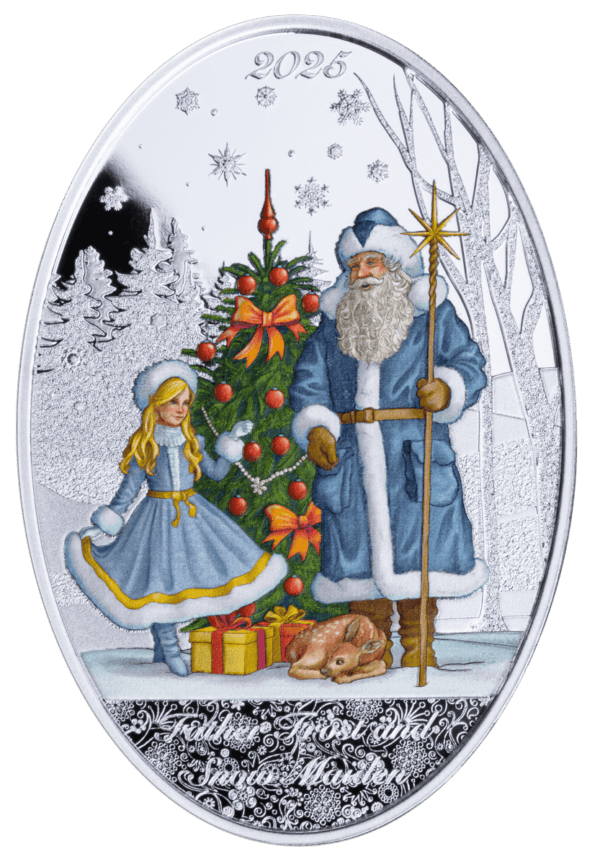 ▶ Enjoy your holiday season together with the characters of our special Christmas series – Father Frost and Snow Maiden: struck in an oval shape, this coin features fine details of various frostings and selective color application on 1 oz of Silver.