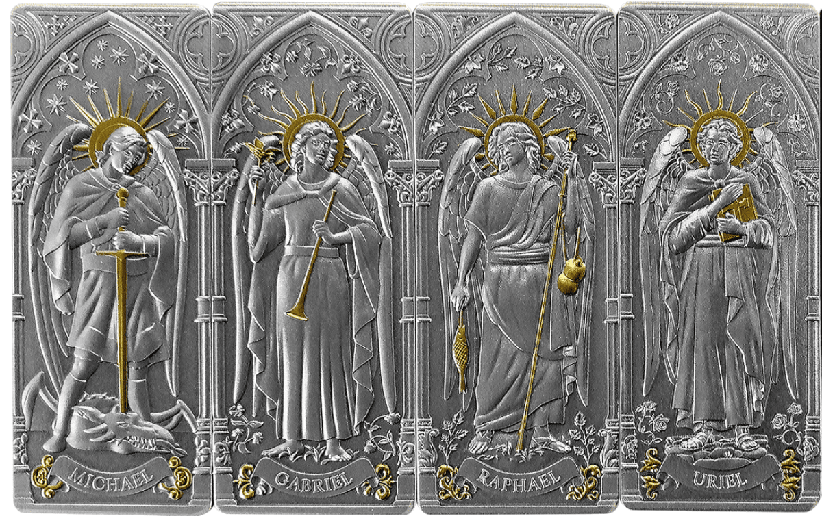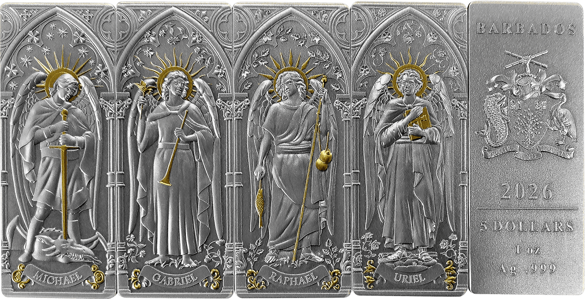The 2026 Archangels 4 x 1 oz Silver Coin Bar Set honors four divine guardians—Michael, Gabriel, Raphael, and Uriel. Each figure holds a unique role in sacred tradition. This set blends spiritual symbolism with masterful design.