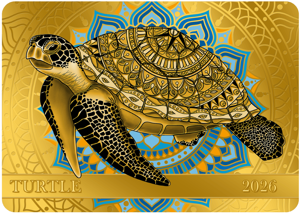 The 2026 Turtle 1/200 oz Gold Proof-like Coin from the Samoa Spirit Animals Collection celebrates the enduring strength and harmony of nature. This edition features a vibrant, color-printed mandala design that honors the turtle’s symbolism of resilience, wisdom, and longevity.
