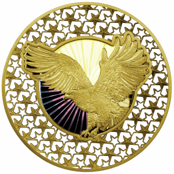 Crafted from 2 ounces of .999 fine silver, the coin spans a bold 60 mm diameter. Designers enhanced the piece with 24k gold plating, a cut-out filigree technique, and a shimmering hologram effect. These elements combine to create a visually dynamic tribute to the eagle’s power and grace.