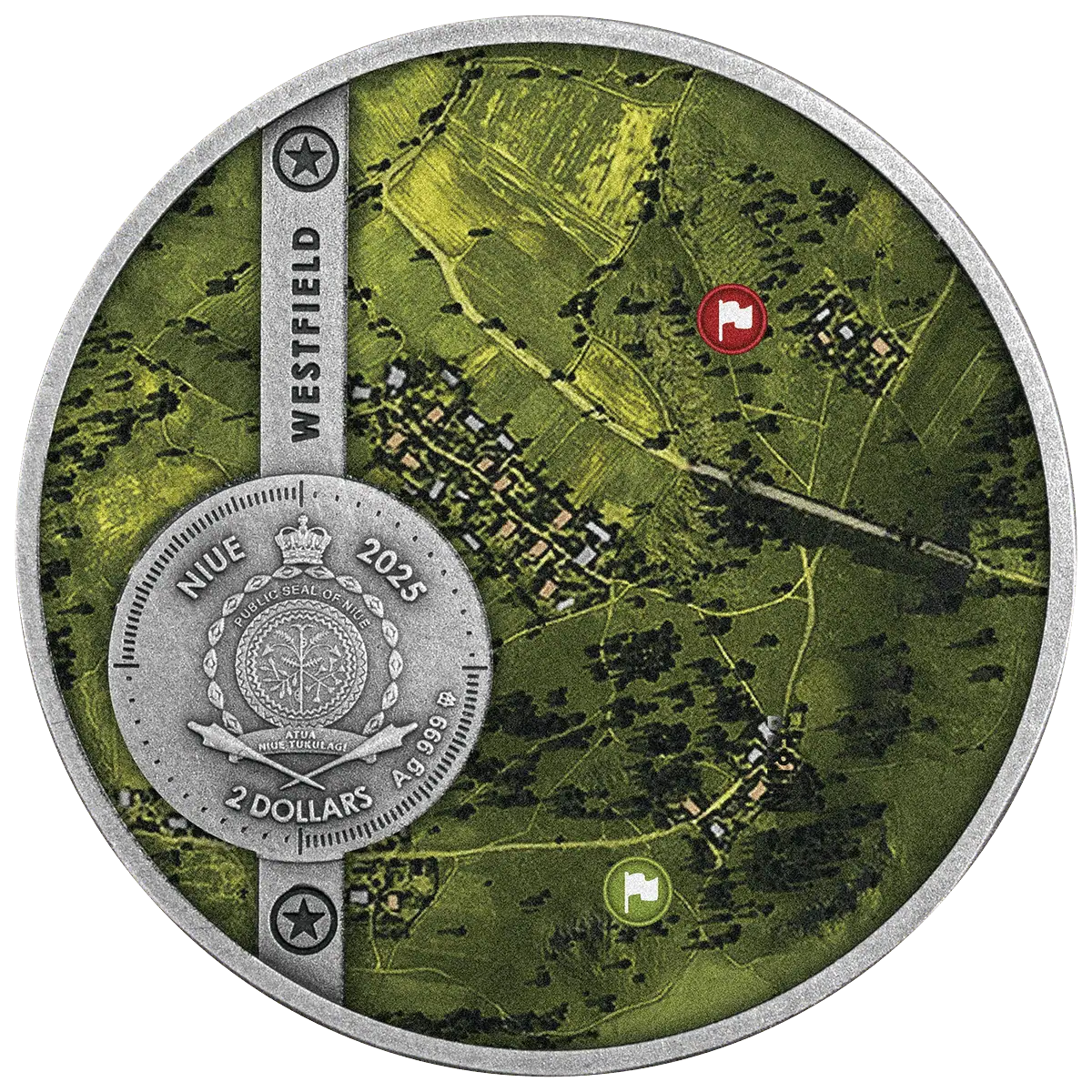 At the center, the Leopard 120 Verbessert tank dominates the design. Sculptors recreated every element—from turret to tread—with mechanical accuracy. On the obverse, the Westfield map appears in full detail, showcasing one of the game’s most iconic battlefields. Together, these features bring the coin to life with immersive realism.