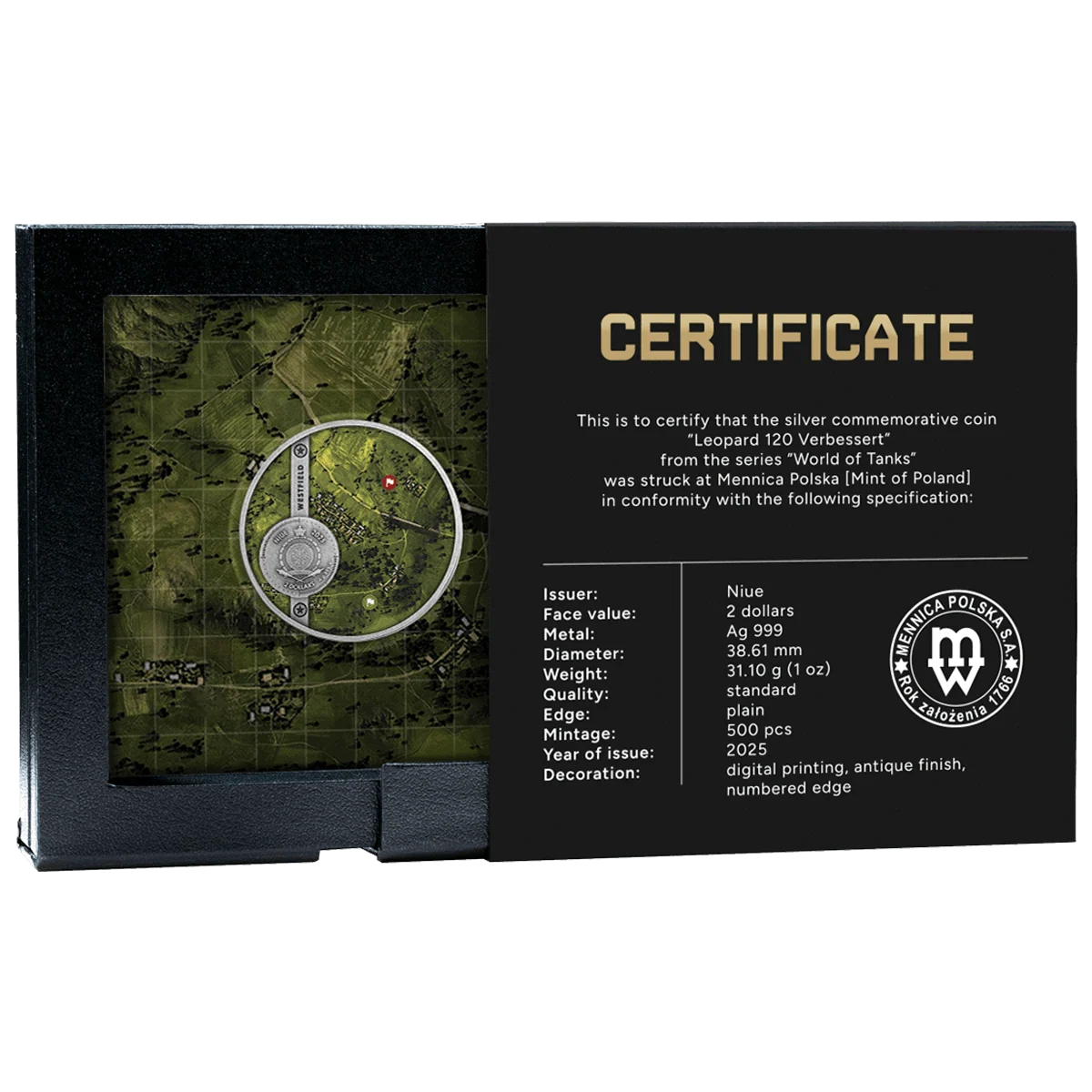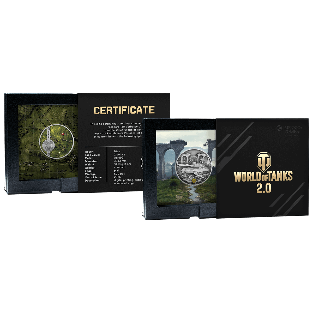 The 2025 Niue World of Tanks Leopard 120 Verbessert 1 oz Silver Antiqued Coin marks a historic first in numismatics. As the world’s first officially licensed World of Tanks coin, it celebrates the launch of World of Tanks 2.0 with engineering precision and battlefield realism.