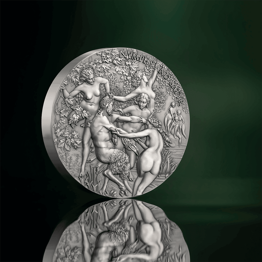 The ‘Nymphs and Satyr 1 Kilo’ coin, created by MINT XXI, embodies a perfect blend of purity, artistry, and celestial beauty. Limited to only 99 pieces worldwide