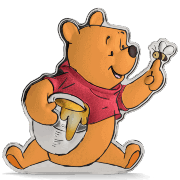 Struck from 1 oz of .999 pure silver, this shaped and colorized coin features Pooh holding a pot of honey under one arm, with a curious bee perched on his finger. The design captures his gentle nature and love for honey in delightful detail, enhanced by a proof-quality finish that adds brilliance and depth.
