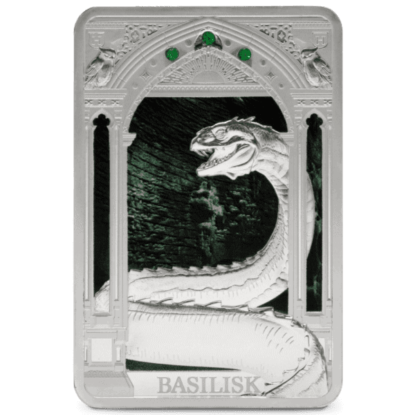 - The Basilisk’s name is featured along the bottom, offset by mirror-finish, and a Hogwarts-inspired arch frames the coin.