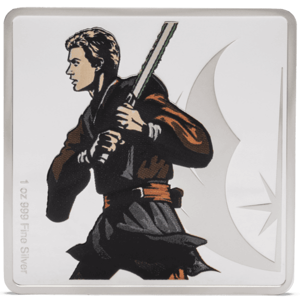 - One side highlights Anakin Skywalker in color wielding his Lightsaber, with the Jedi crest behind.