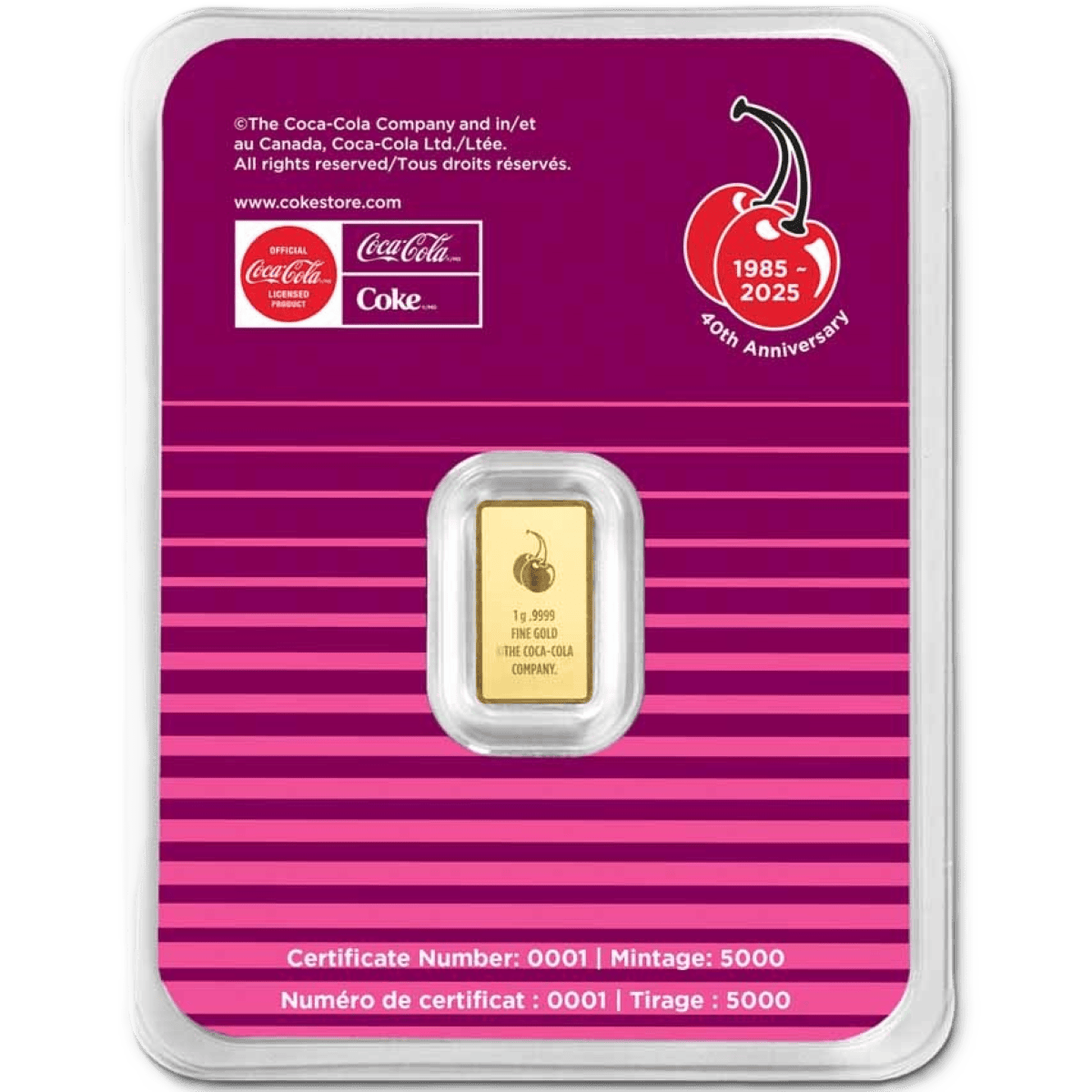 This bar contains 0.016075 oz of .9999 fine gold. The obverse displays the original Cherry Coke® design. The reverse features two cherries with the metal content below. Each bar arrives sealed in tamper‑evident packaging (TEP). Collectors also receive a certificate of authenticity. The compact size makes it easy to store, display, or gift.