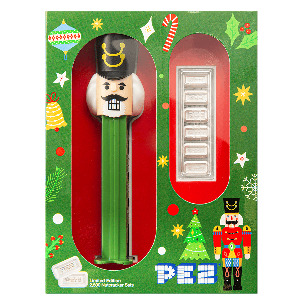 The 2025 PAMP Holiday Nutcracker PEZ 30 Gram Silver Wafers and Dispenser Set blends nostalgia and luxury in one cheerful collectible. Struck by PAMP Suisse, this festive release transforms the classic PEZ® candy design into fine silver wafers, complete with an authentic working dispenser.