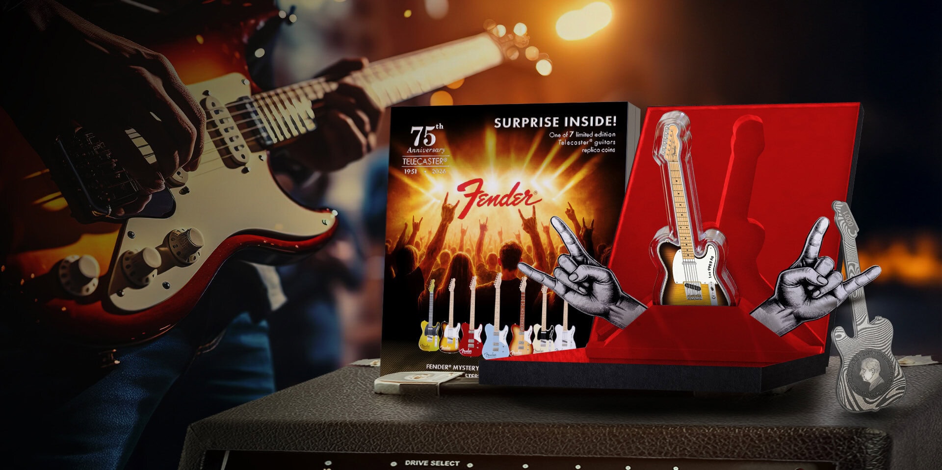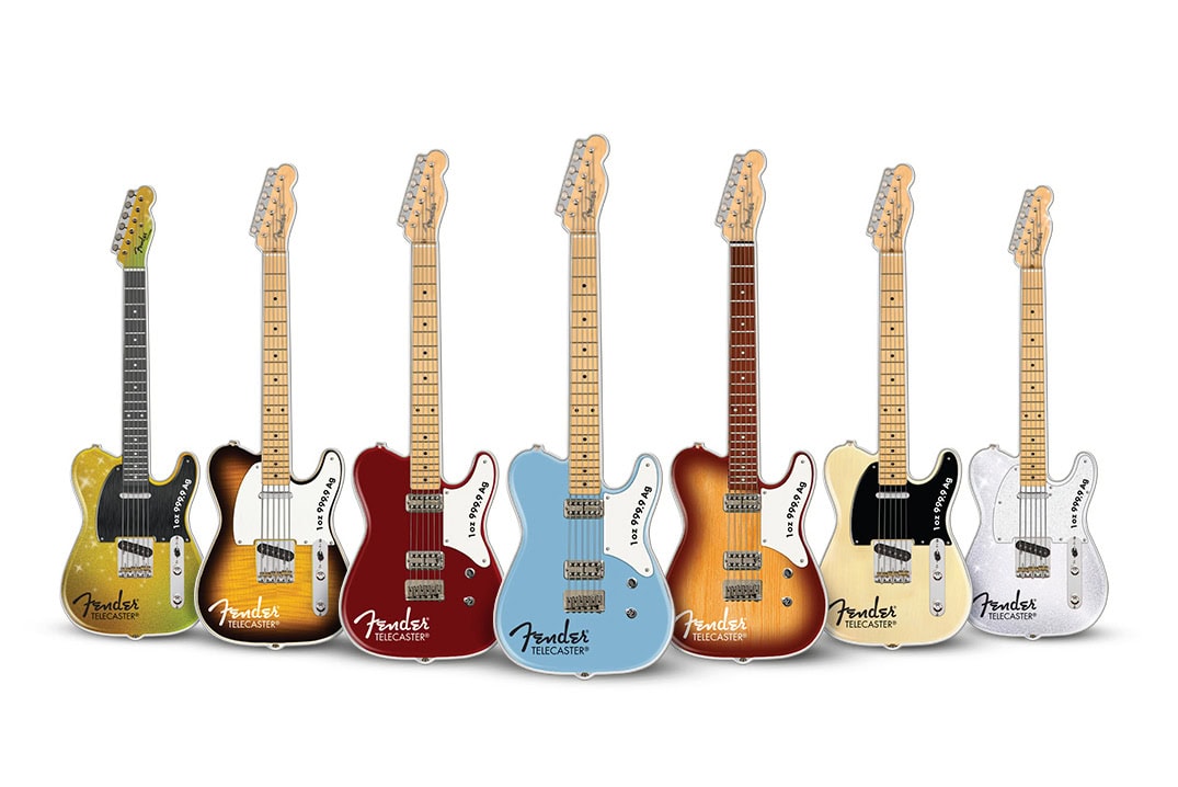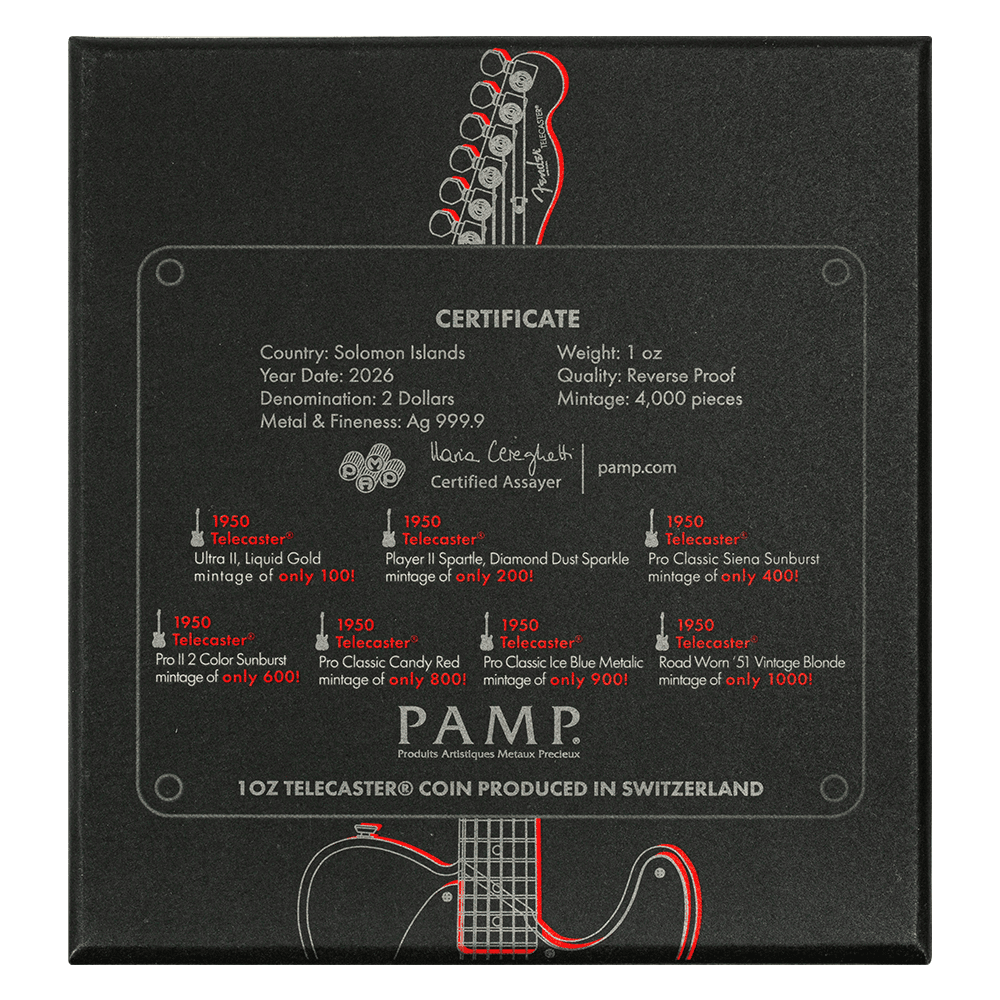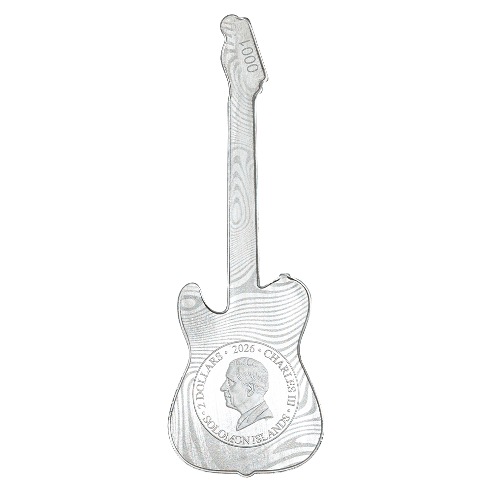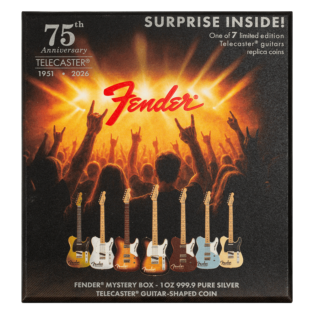 The 2026 Solomon Islands Fender Telecaster 75th Anniversary 1 oz Silver Coin Blind Box celebrates one of the most iconic guitars in music history. This officially licensed release honors the Telecaster’s 75-year legacy with a creative and highly collectible concept. Each blind box contains one of seven limited edition Telecaster designs, recreated in stunning detail as a guitar-shaped silver coin.