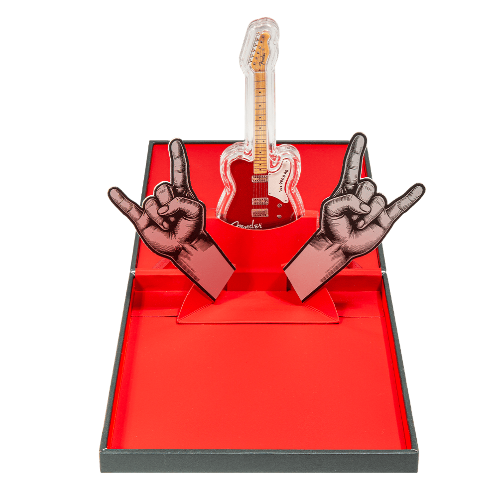 Crafted from 1 oz of .9999 fine silver, this piece combines artistic precision with modern minting innovation. The elongated format, measuring 29.3 x 88.3 mm, mirrors the recognizable shape of the Telecaster. As a result, it stands out as a bold and unconventional addition to any collection. The proof-like finish enhances the intricate details, while also providing a sleek and polished appearance.