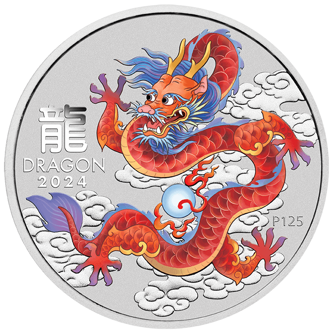 Each coin’s reverses portray one of the coloured dragons with a flaming pearl. Included in the design is the Chinese character for ‘dragon’, the inscription’ DRAGON 2024’ and a ‘P125’ mintmark signifying the Perth Mint’s 125th anniversary.