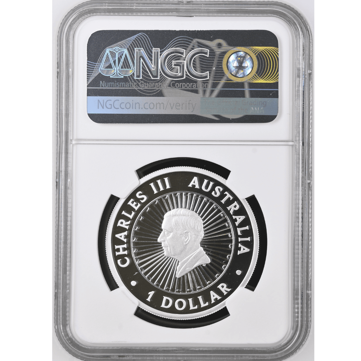 This proof coin has been graded PF 70 Ultra Cameo (UCAM) by NGC, signifying flawless quality and brilliant contrast. The obverse bears Dan Thorne’s effigy of His Majesty King Charles III, marking a new chapter in Australian coinage. The coin measures 36.60 mm in diameter and 3.95 mm thick, with a face value of AUD $1. Its limited mintage of just 5,000 coins ensures lasting desirability among serious collectors.