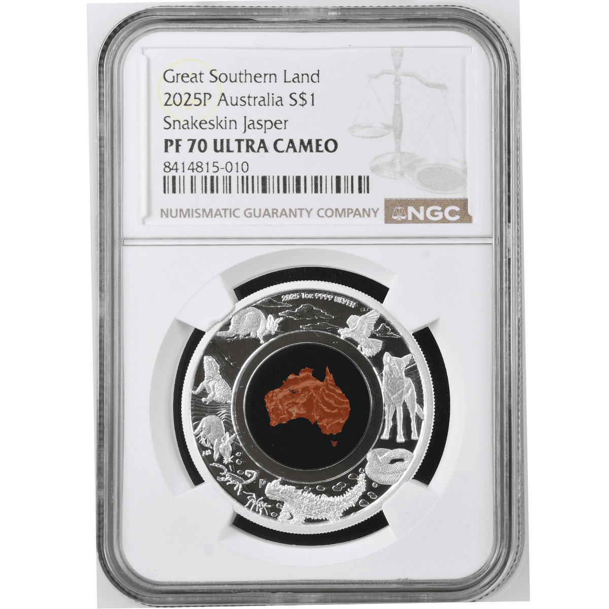 For more than a century, GR Reserve has connected collectors with exclusive world-mint releases that combine artistry and authenticity. The 2025 Australia Great Southern Land 1 oz Silver Snakeskin Jasper Coin NGC PF 70 UCAM from The Perth Mint continues that legacy. It celebrates Australia’s breathtaking deserts and the diverse wildlife that thrives across this remarkable continent. Struck from 1 troy ounce of 99.99% pure silver, this limited-edition coin honors the land’s rugged beauty and enduring spirit.