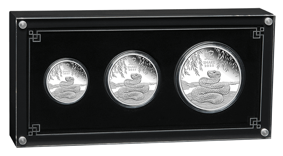 The Perth Mint will release no more than 1,000 of the Australian Lunar Series III 2025 Year of the Snake Three-Coin Silver Proof Set.