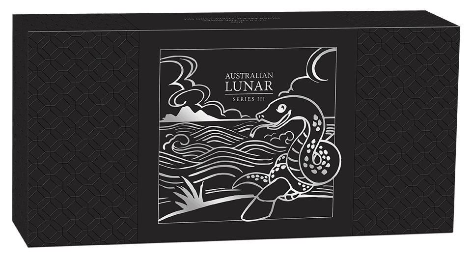 Accompanied by a numbered certificate of authenticity, the three coins are presented in a prestigious black display case with a geometric design on its magnetic lid. The case is packaged in an illustrated shipper featuring a snake.