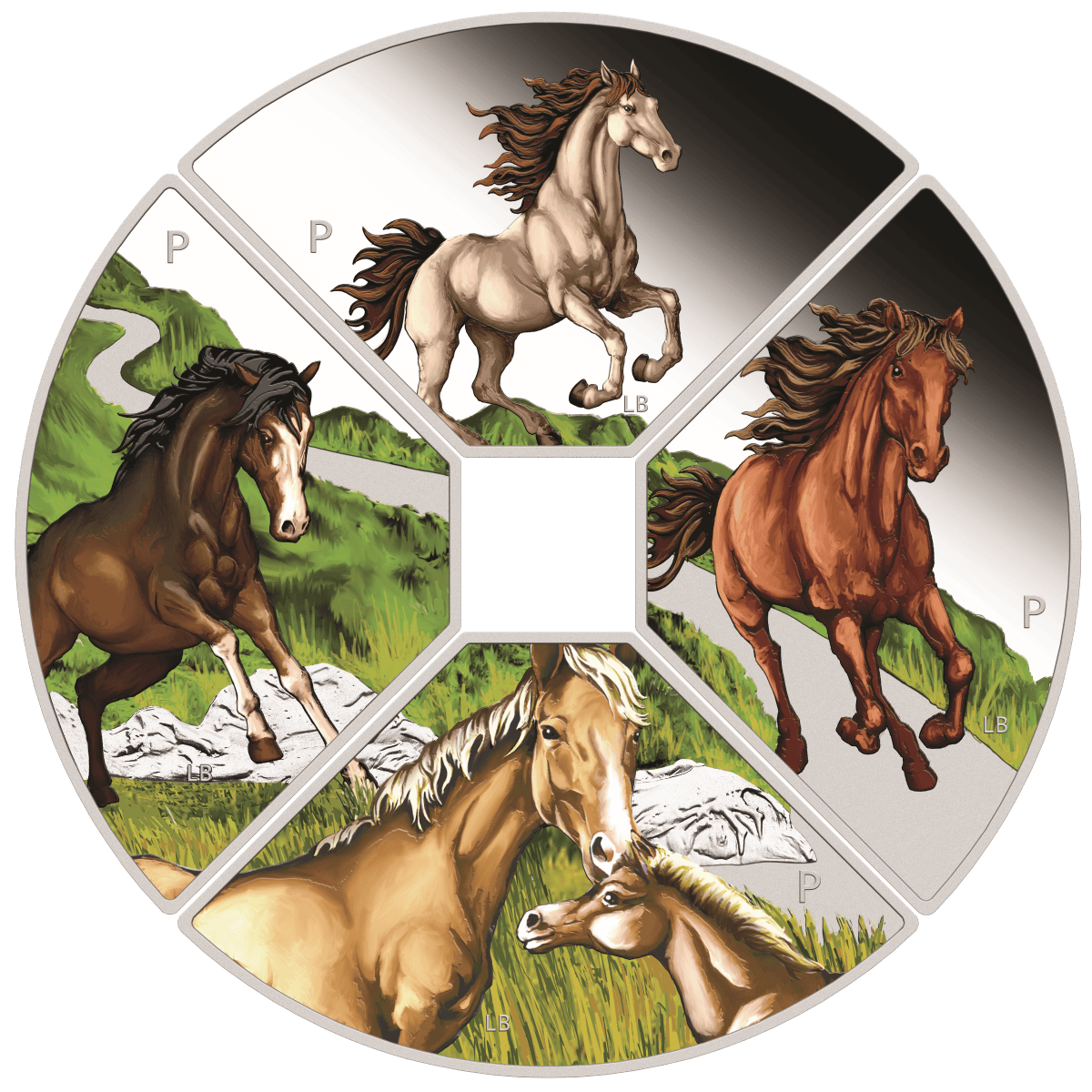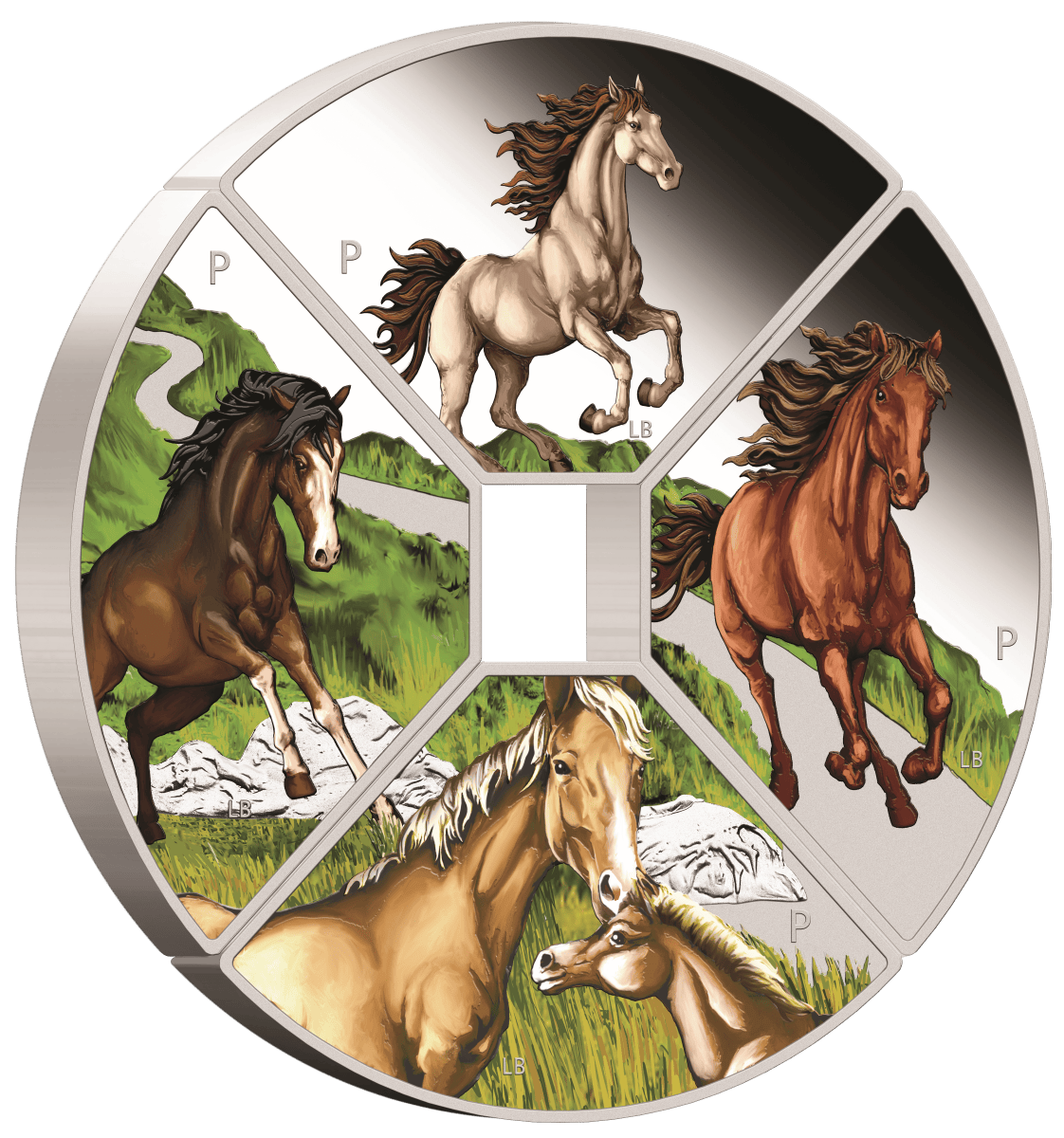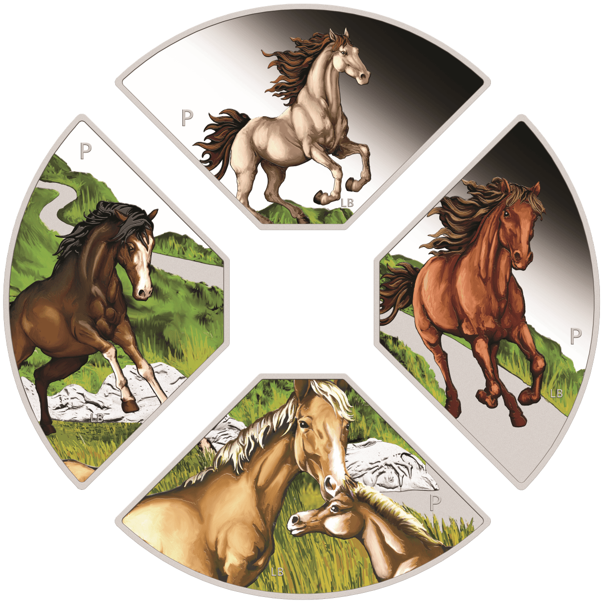 In honor of the seventh sign in the Chinese lunar calendar, each quadrant celebrates the Year of the Horse—a symbol of independence, charisma, and adventure. Specifically, the top coin features a white Friesian horse with a brown mane, rearing in a powerful stance. Meanwhile, the right quadrant shows a chestnut-colored horse galloping along a peaceful country path. Below, a Palomino mare and her foal face each other, both with golden coats and white manes. Finally, the left coin depicts a dark bay horse standing proudly on rocky terrain. Each design includes the initials of reverse designer Lucas Bowers and The Perth Mint’s ‘P’ mintmark, while the obverse showcases the work of Jody Clark.