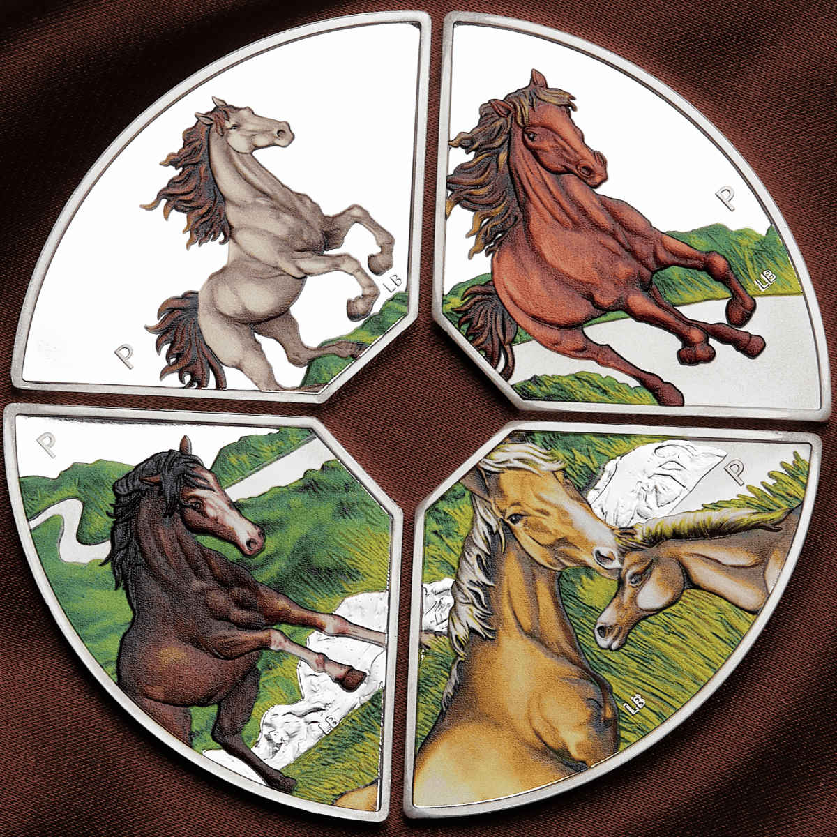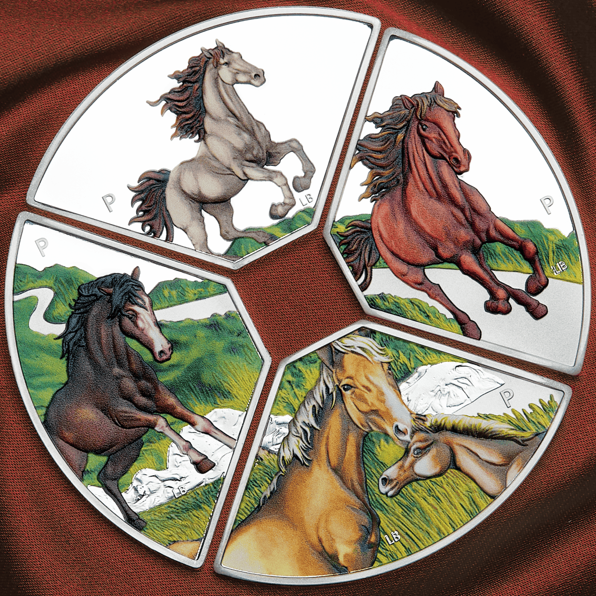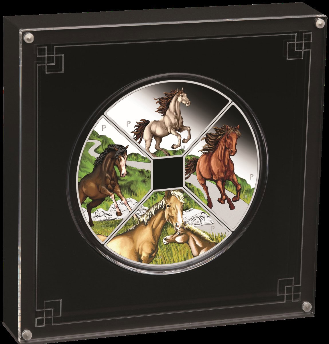 In honor of the seventh sign in the Chinese lunar calendar, each quadrant celebrates the Year of the Horse—a symbol of independence, charisma, and adventure. Specifically, the top coin features a white Friesian horse with a brown mane, rearing in a powerful stance. Meanwhile, the right quadrant shows a chestnut-colored horse galloping along a peaceful country path. Below, a Palomino mare and her foal face each other, both with golden coats and white manes. Finally, the left coin depicts a dark bay horse standing proudly on rocky terrain. Each design includes the initials of reverse designer Lucas Bowers and The Perth Mint’s ‘P’ mintmark, while the obverse showcases the work of Jody Clark.