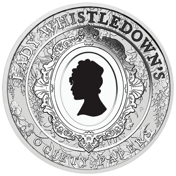 The reverse features an illustrated portrait of Lady Whistledown, framed by an ornate Regency-style border that reflects the elegance of London’s high society. Rich colorization brings depth and contrast to the portrait, while fine line work preserves a classic look. Encircling the artwork is the inscription “LADY WHISTLEDOWN’S SOCIETY PAPERS”, reinforcing the character’s influence and mystique. In addition, The Perth Mint’s ‘P’ mintmark confirms authenticity and quality.