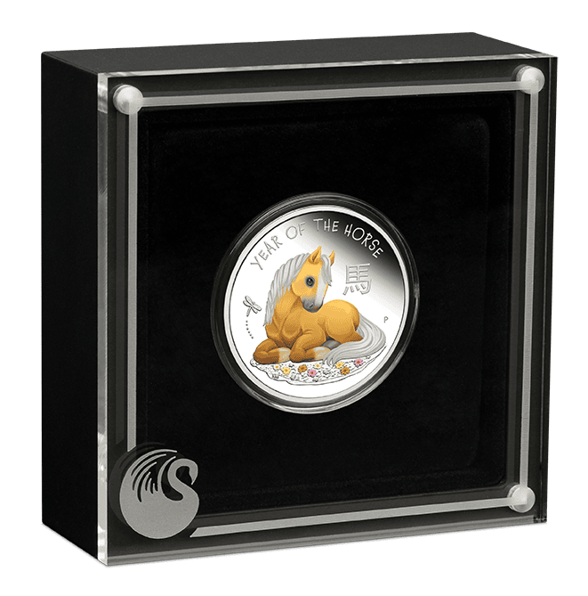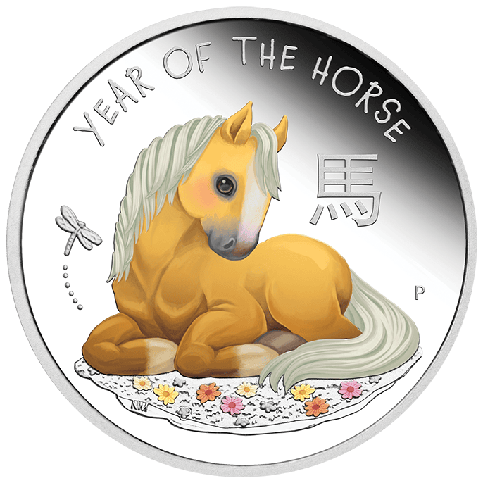 Minted from 1/2 troy ounce of 99.99% pure silver, this colorized proof coin highlights the skill of designer Natasha Muhl. The reverse features a happy young horse resting on a grassy field surrounded by flowers. Above it, a delicate dragonfly flutters, adding to the playful tone. The design also includes the Chinese character for horse, the words “Year of the Horse,” and The Perth Mint’s “P” mintmark—symbols of quality and authenticity.