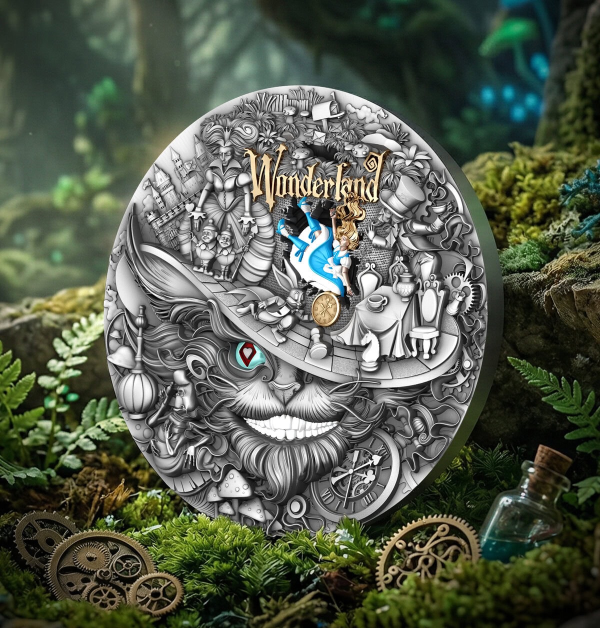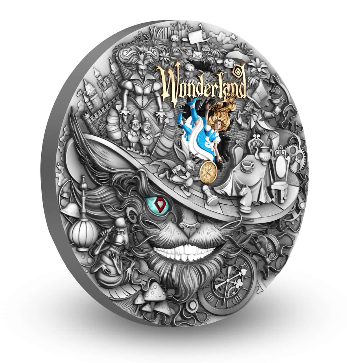 The antique finish adds texture and shadow, reinforcing the surreal atmosphere of the scene. Light moves softly across the relief, revealing hidden details and symbolic nuances. As a result, the coin feels immersive and dimensional, much like the story that inspired it.