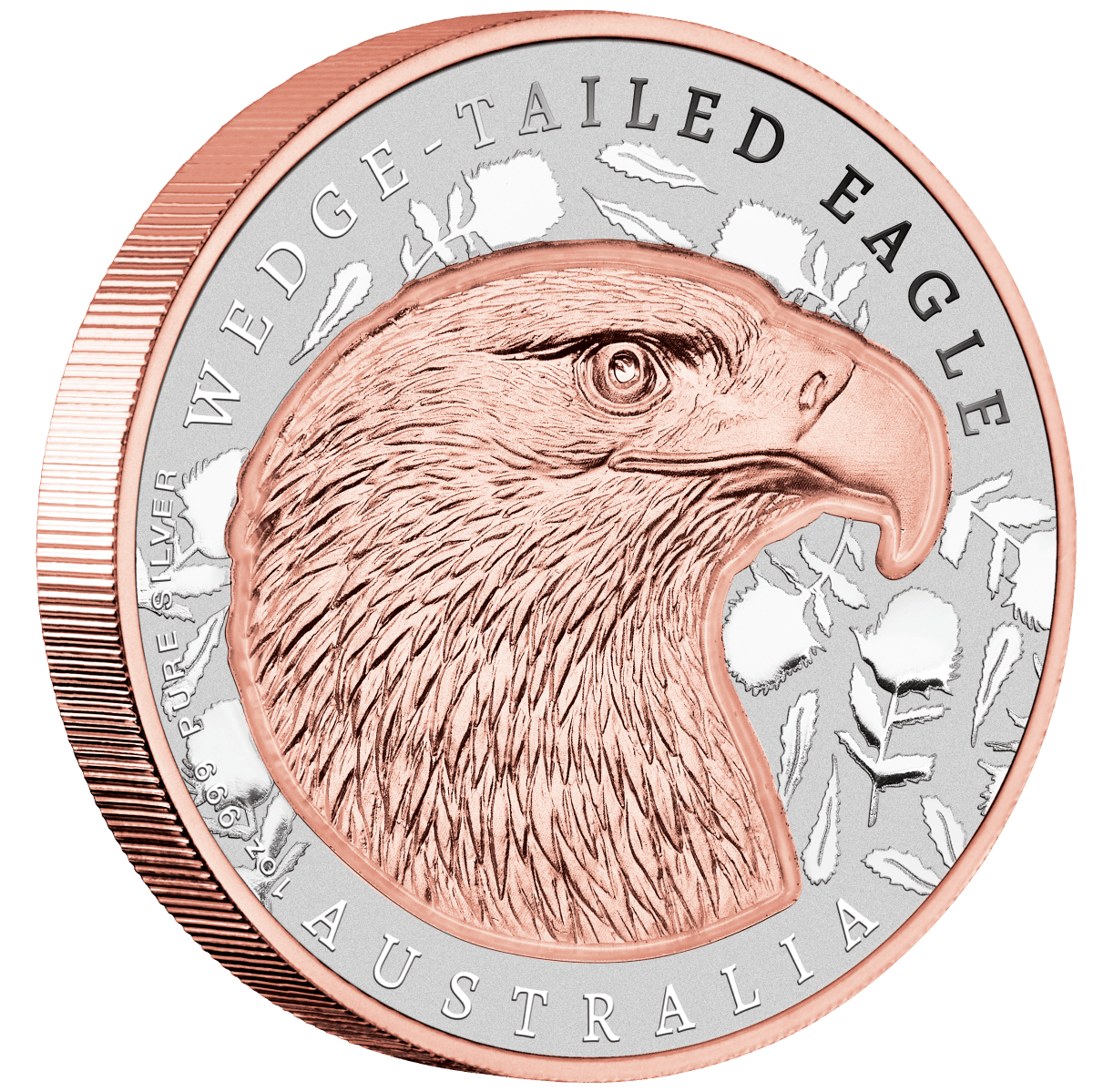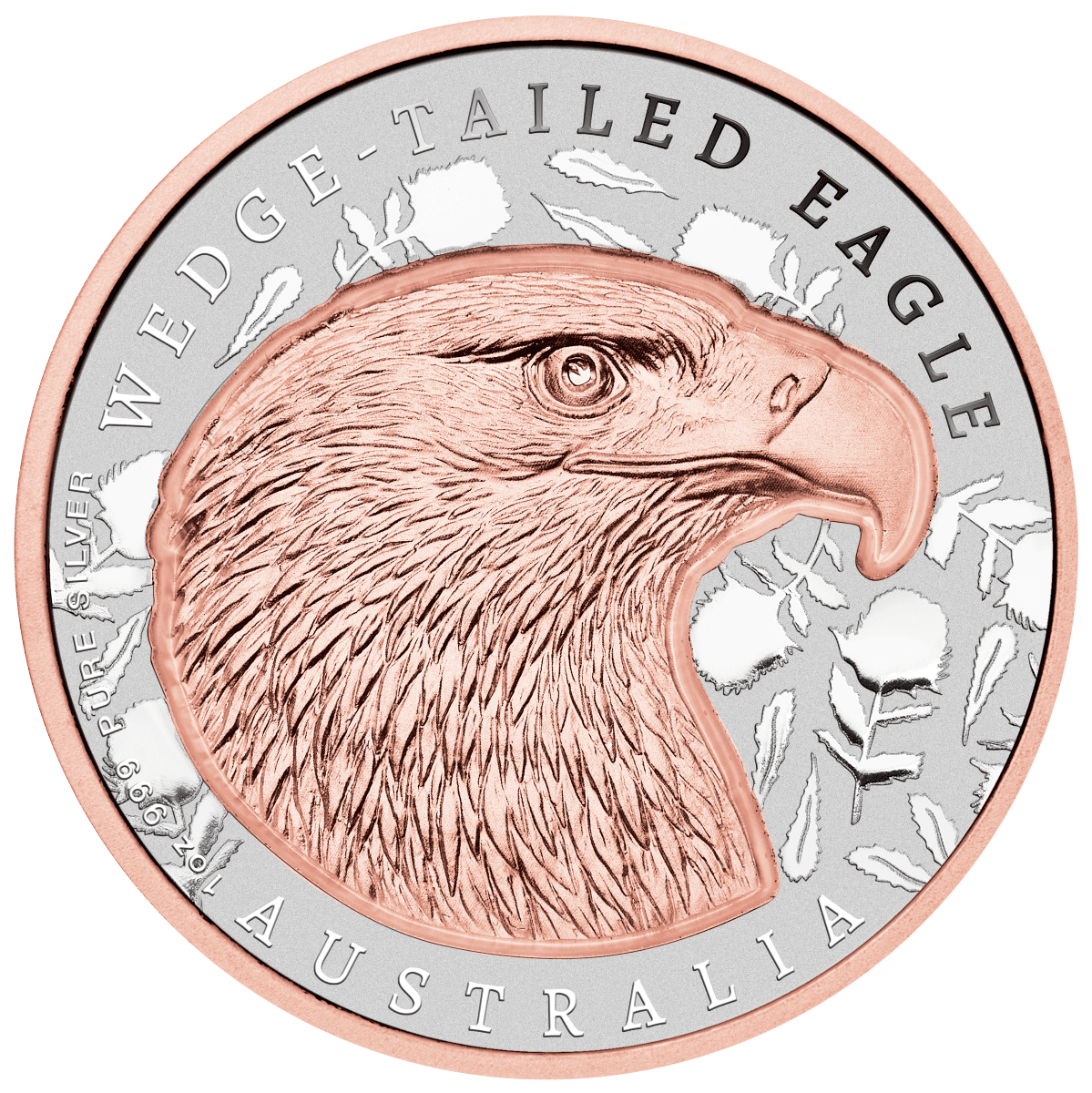 Selective rose gold plating enhances the incused eagle, the outer rim, and the coin’s edge. In contrast, a detailed Banksia flower pattern fills the reverse background, adding texture and cultural significance. Together, the silver and rose gold finishes create a balanced and elegant presentation that feels both modern and timeless.