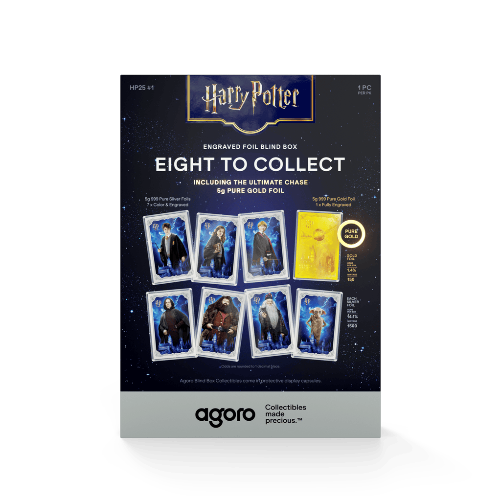 Celebrating 25 years of Harry Potter magic, Agoro launches a brand-new Blind Box series with seven characters to hunt. Specifically, each character—Harry, Ron, Hermione, Dumbledore, Hagrid, Snape, and Dobby—appears struck in full color on 5g of 999 pure silver. Moreover, Agoro limits each character to 1,500 worldwide. Excitingly, the ultra-rare chase features a fully engraved Golden Snitch on 5g of 999 pure gold, with just 150 in existence and 1.4% odds per box. Additionally, every case contains 10 blind boxes: a complete set of all seven characters plus three additional—maximum two of any one character per case. Officially licensed, each piece arrives individually numbered in Harry Potter-themed packaging.