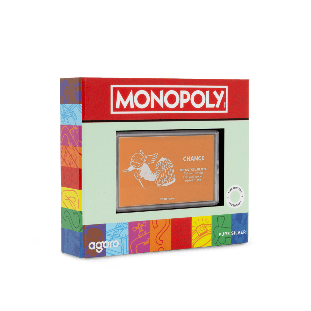 Every collector will want this one in their hand. Indeed, Agoro recreates the original Monopoly “Get Out of Jail Free” Chance card on 1oz of 999 pure silver. Moreover, the piece features the vintage design and signature orange coloring from the classic card. Meanwhile, the reverse showcases an engraved Chance Card pattern and antique-finish question mark. As a standalone release, this nostalgic collectible appeals to both Monopoly fans and silver enthusiasts. Officially licensed by Hasbro and limited to 1,000 worldwide, each piece arrives in official Monopoly display packaging. Furthermore, Agoro individually numbers every coin.