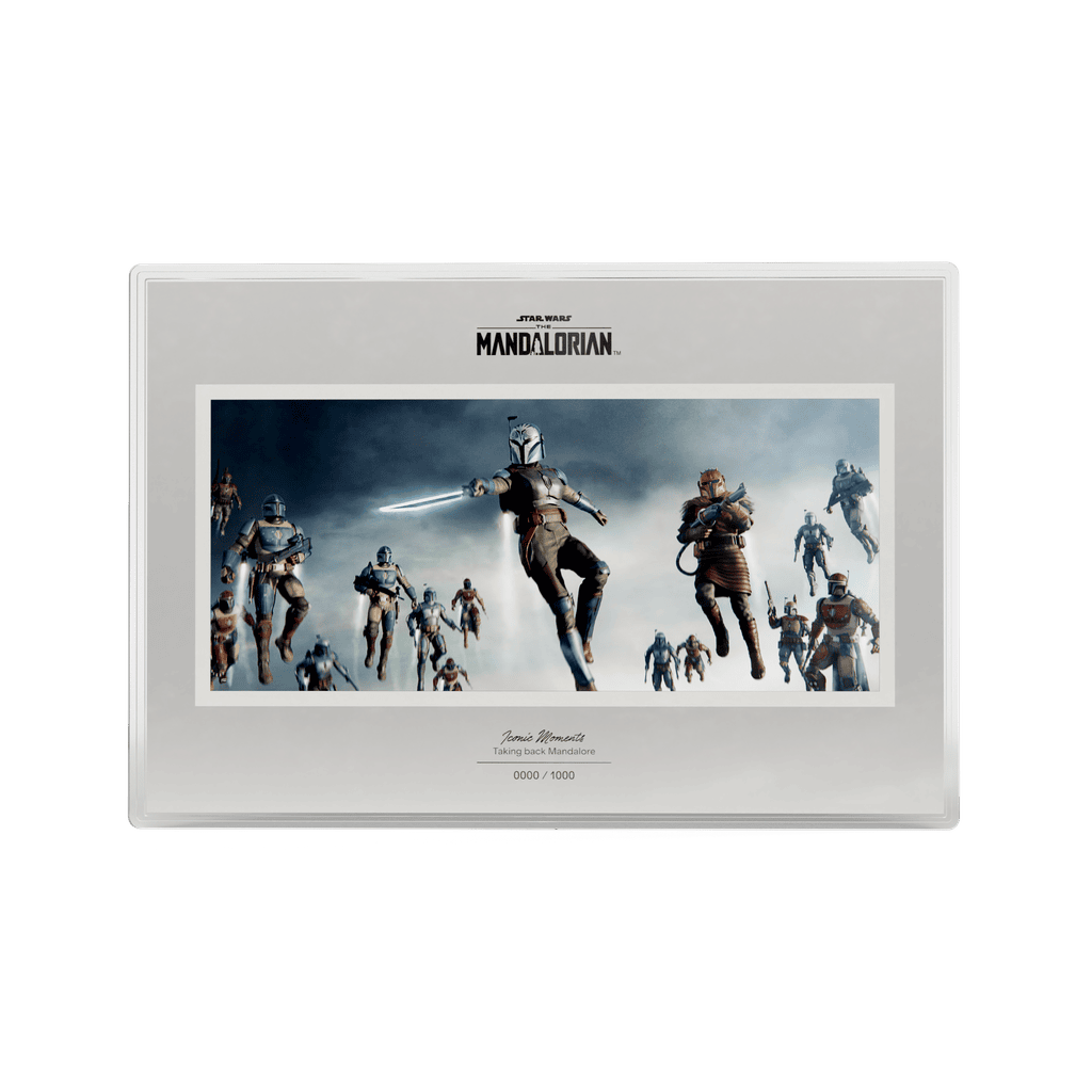 The Legends of Mandalore series concludes with its most epic installment yet. Indeed, this final release captures the Mandalorians’ mission to reclaim Mandalore and defeat Moff Gideon. Featuring full-color landscape concept art on 1oz of 999 pure silver, the piece showcases stunning cinematic detail. Additionally, artisans include an “Iconic Moments” signature and unique number out of 1,000. Meanwhile, the sleek back design features a mirror-finish Star Wars logo. As a fitting close to this celebrated series, collectors can acquire only 1,000 pieces worldwide.