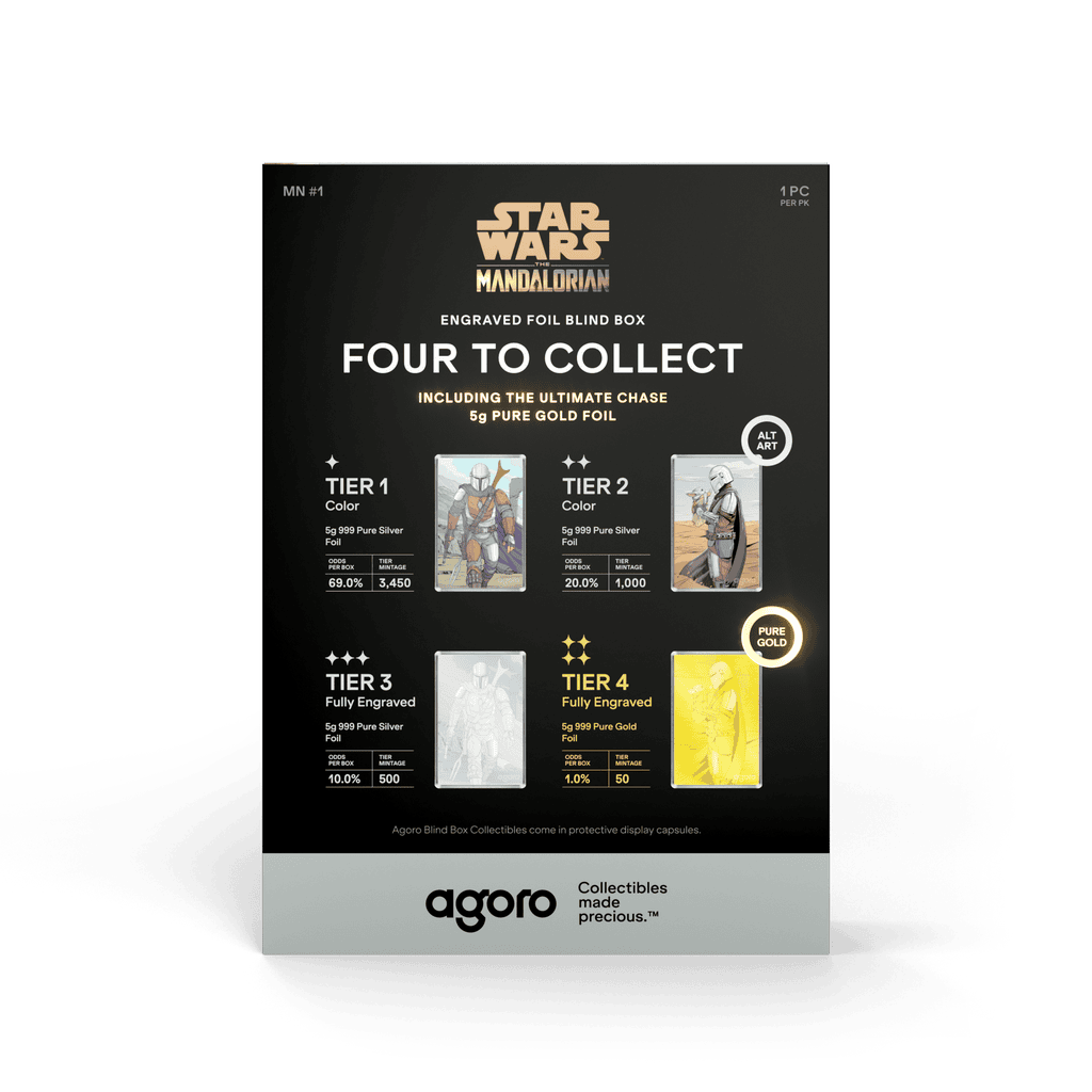 Agoro’s first Blind Box release featuring officially licensed Star Warsâ„¢: The Mandalorian collectibles has arrived. Remarkably, each sealed box holds one of four limited-edition 5g foils in 999 pure silver or 999 pure gold. However, the design remains a mystery until the reveal. Tier 1 and Tier 2 showcase Din Djarin in vibrant color scenes, from blaster-drawn bounty hunting to protecting Grogu. Meanwhile, Tier 3 features a fully engraved silver design. Finally, Tier 4—with just 1% odds and a mintage of 50—reveals the ultimate bounty: Din Djarin and Grogu engraved on pure gold. As a result, collectors face thrilling odds across 5,000 total boxes.